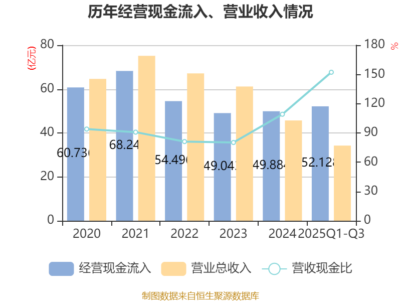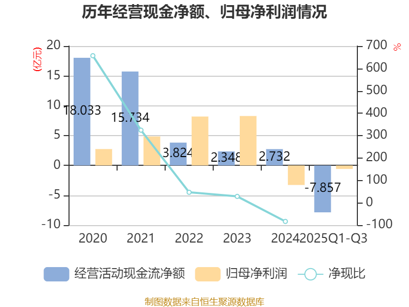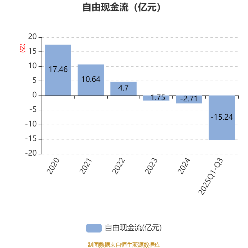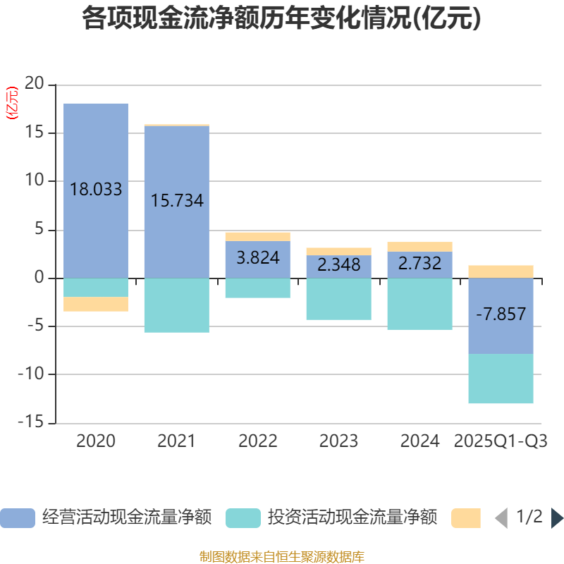 2025年前三季度,公司经营活动现金流净额为-7.86亿元,同比增加4.03亿元;筹资活动现金流净额1.3亿元,同比减少3.52亿元;投资活动现金流净额-5.12亿元,上年同期为-2.98亿元。