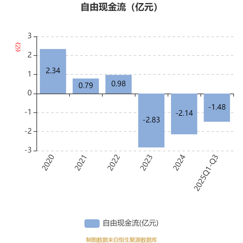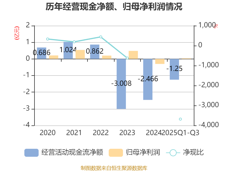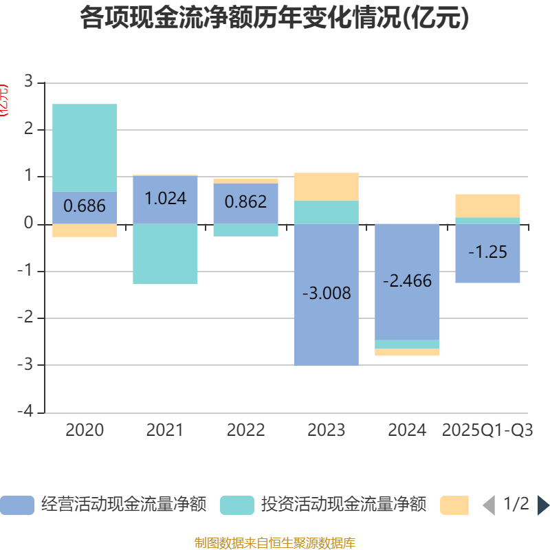 2025年前三季度,公司经营活动现金流净额为-1.25亿元,同比增加2.41亿元;筹资活动现金流净额4901.76万元,同比减少5227.33万元;投资活动现金流净额1382.52万元,上年同期为-125.81万元。