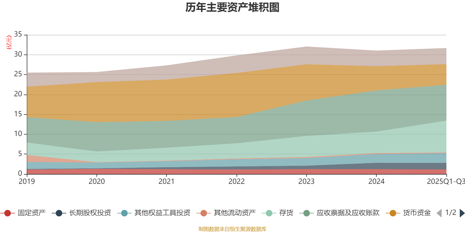 资产重大变化方面,截至2025年三季度末,公司存货较上年末增加47.89%,占公司总资产比重上升7.82个百分点;应收票据及应收账款较上年末减少13.08%,占公司总资产比重下降4.96个百分点;货币资金较上年末减少14.63%,占公司总资产比重下降3.21个百分点;预付款项较上年末增加40.67%,占公司总资产比重上升0.84个百分点。