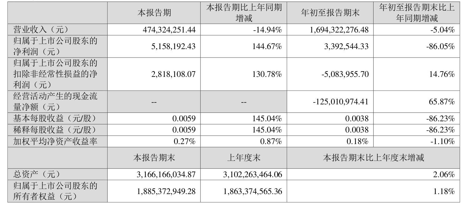 中证智能财讯宜通世纪(300310)10月28日披露2025年第三季度报告。前三季度公司实现营业总收入16.94亿元,同比下降5.04%;归母净利润339.25万元,同比下降86.05%;扣非净利润亏损508.4万元,上年同期亏损596.44万元;经营活动产生的现金流量净额为-1.25亿元,上年同期为-3.66亿元;报告期内,宜通世纪基本每股收益为0.0038元,加权平均净资产收益率为0.18%。