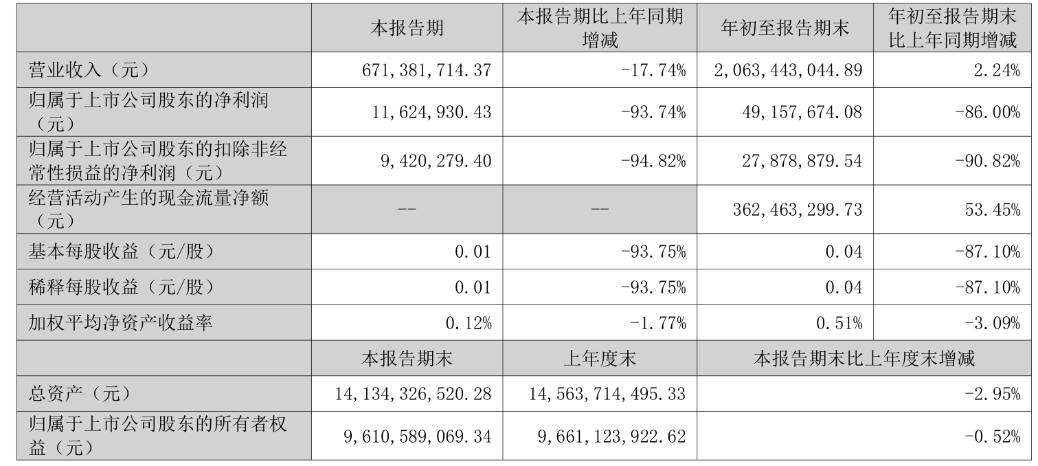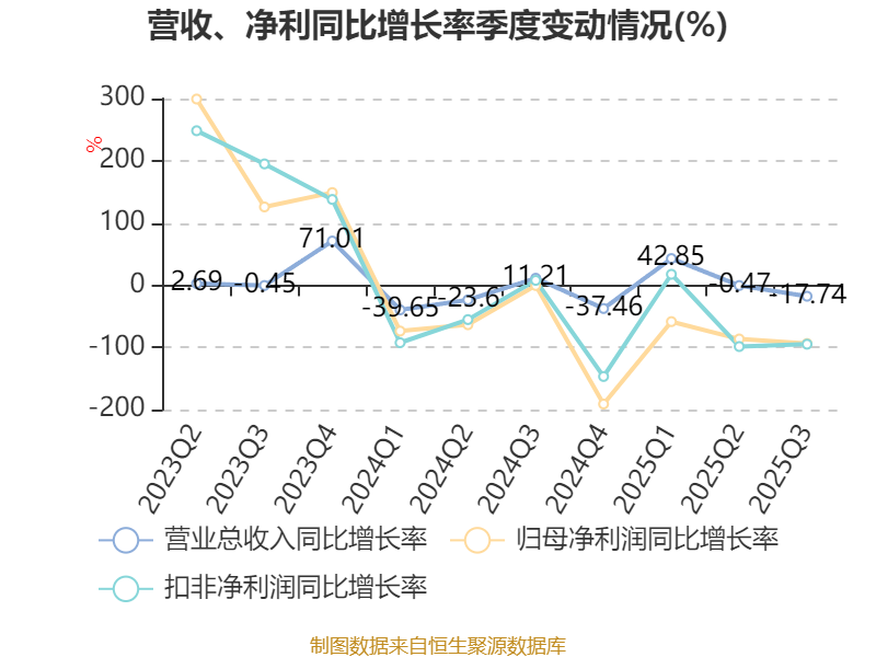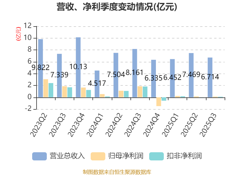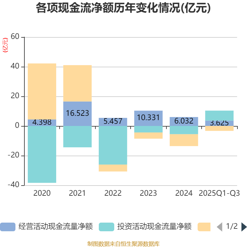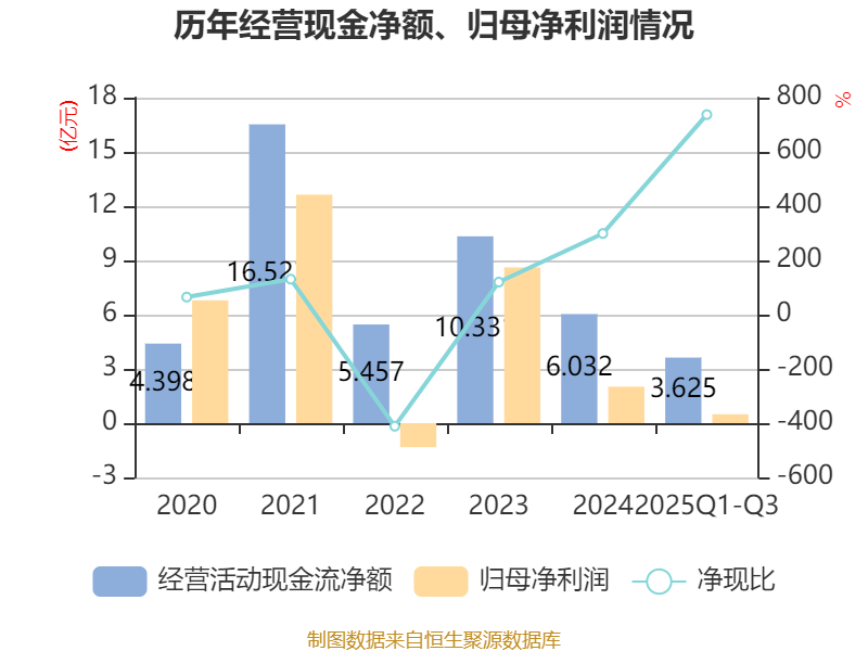 2025年前三季度,公司经营活动现金流净额为3.62亿元,同比增长53.45%;筹资活动现金流净额-3.3亿元,同比增加3.46亿元;投资活动现金流净额6.74亿元,上年同期为-5.58亿元。