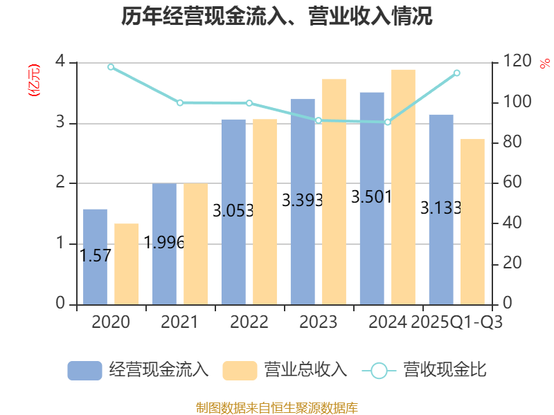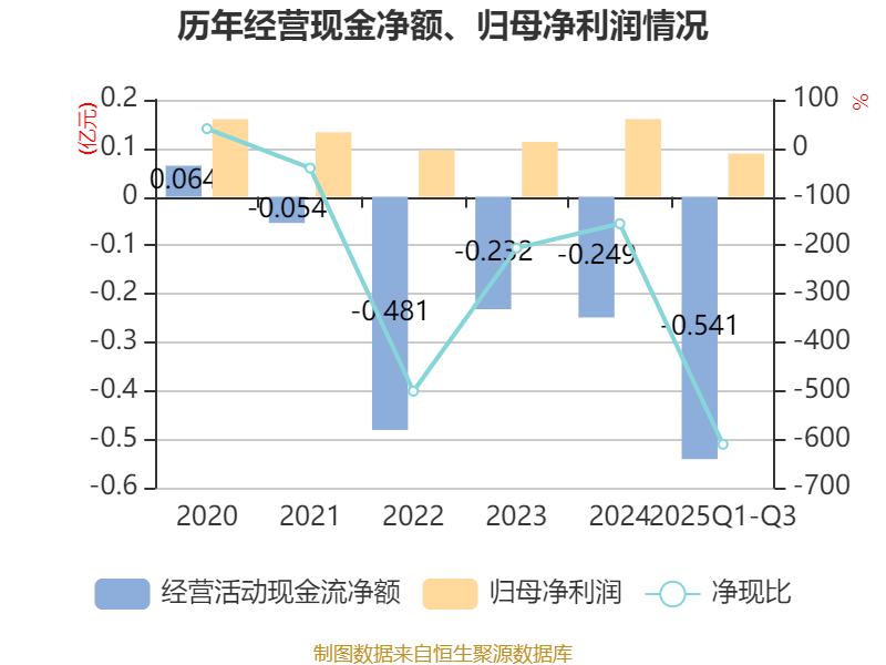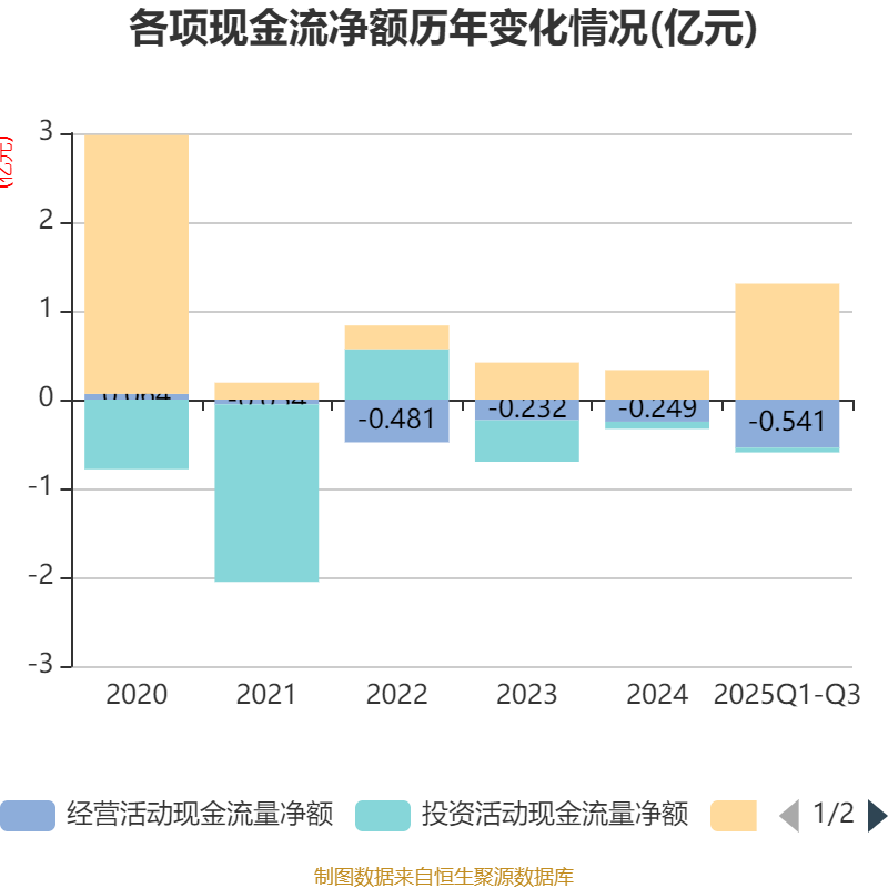 2025年前三季度,公司经营活动现金流净额为-5411.45万元,同比减少3426.26万元;筹资活动现金流净额1.31亿元,同比增加8563.56万元;投资活动现金流净额-541.01万元,上年同期为-610.32万元。