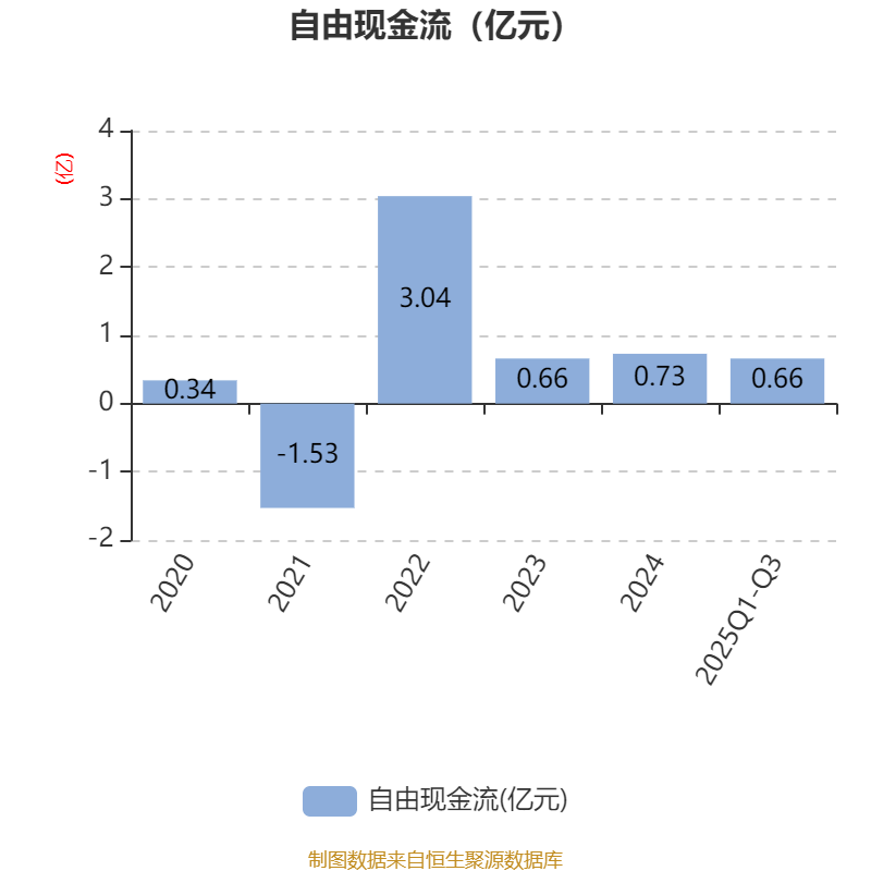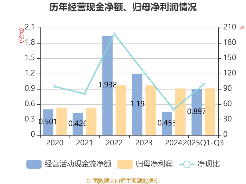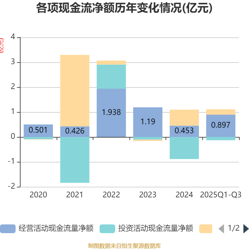 2025年前三季度,公司经营活动现金流净额为8968.92万元,同比增长32.68%;筹资活动现金流净额2142.04万元,同比减少1.44亿元;投资活动现金流净额-1332.91万元,上年同期为-6059万元。