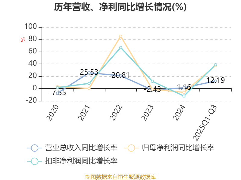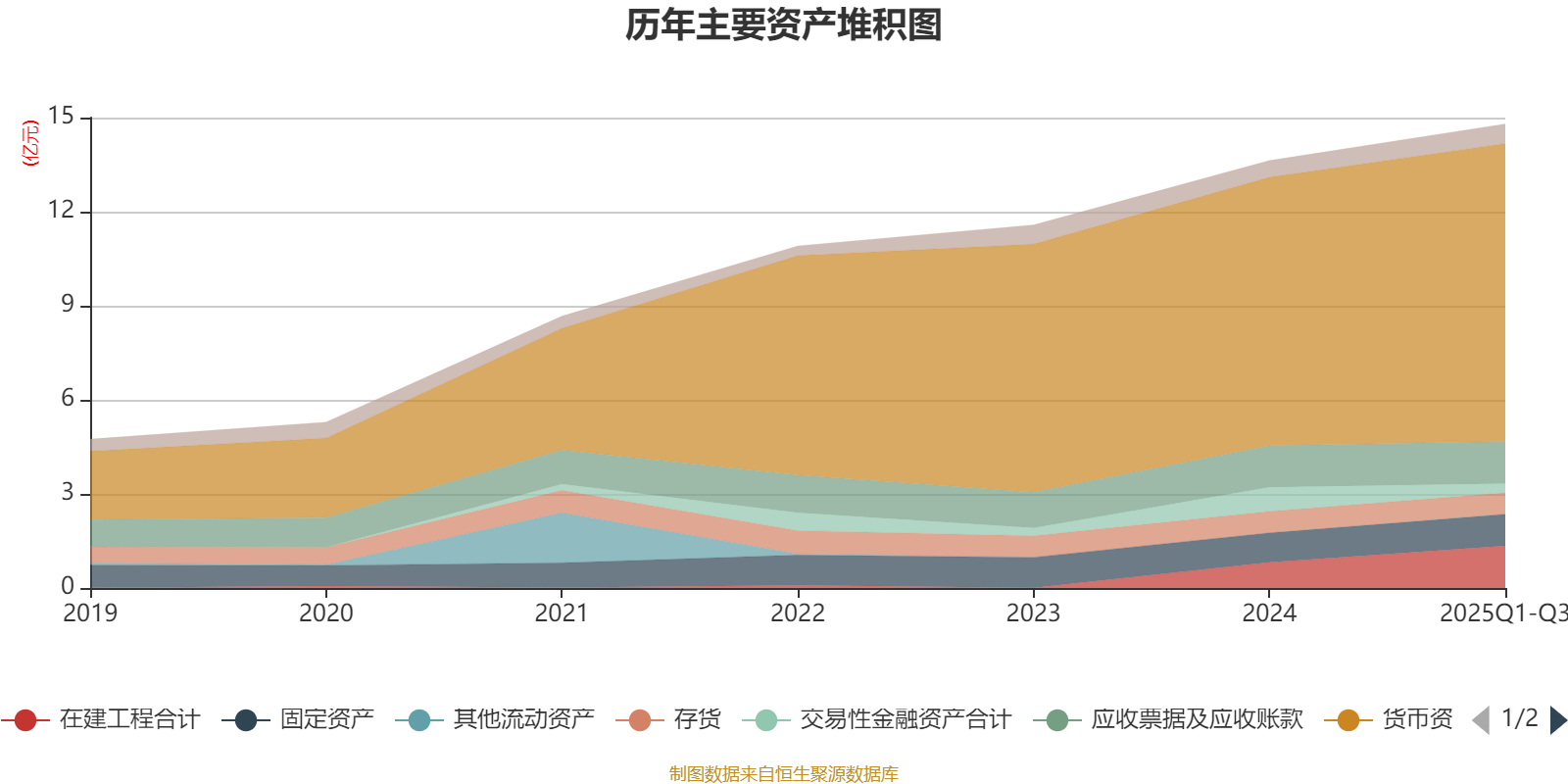 资产重大变化方面,截至2025年三季度末,公司交易性金融资产合计较上年末减少62.21%,占公司总资产比重下降3.66个百分点;在建工程合计较上年末增加64.92%,占公司总资产比重上升3.11个百分点;货币资金较上年末增加11%,占公司总资产比重上升1.41个百分点;应收款项融资较上年末增加149.74%,占公司总资产比重上升0.76个百分点。