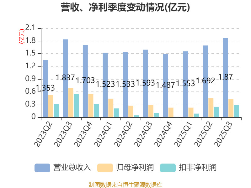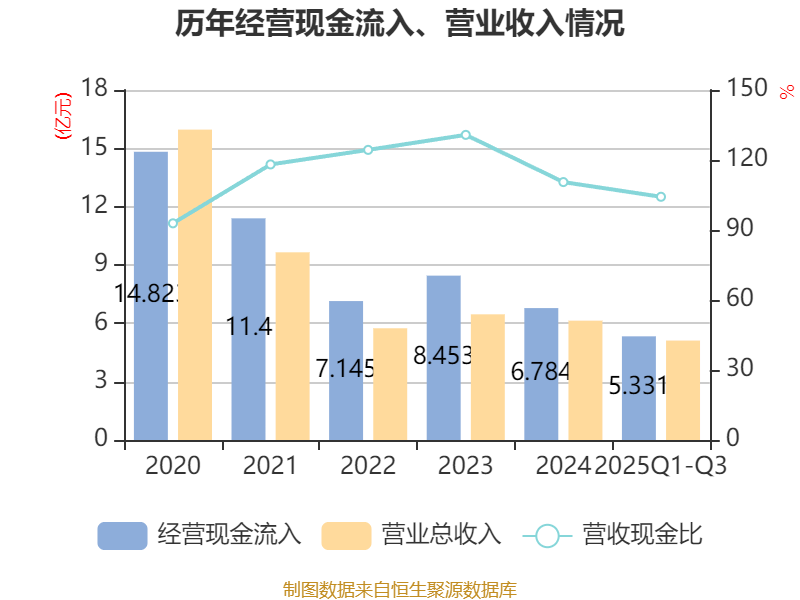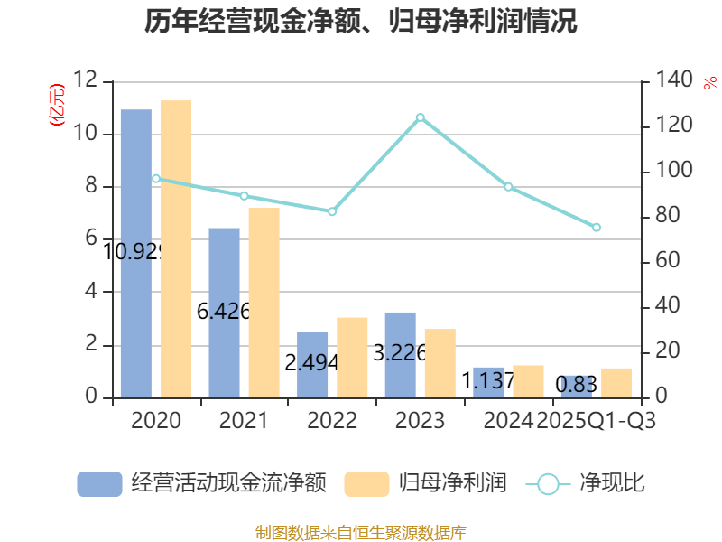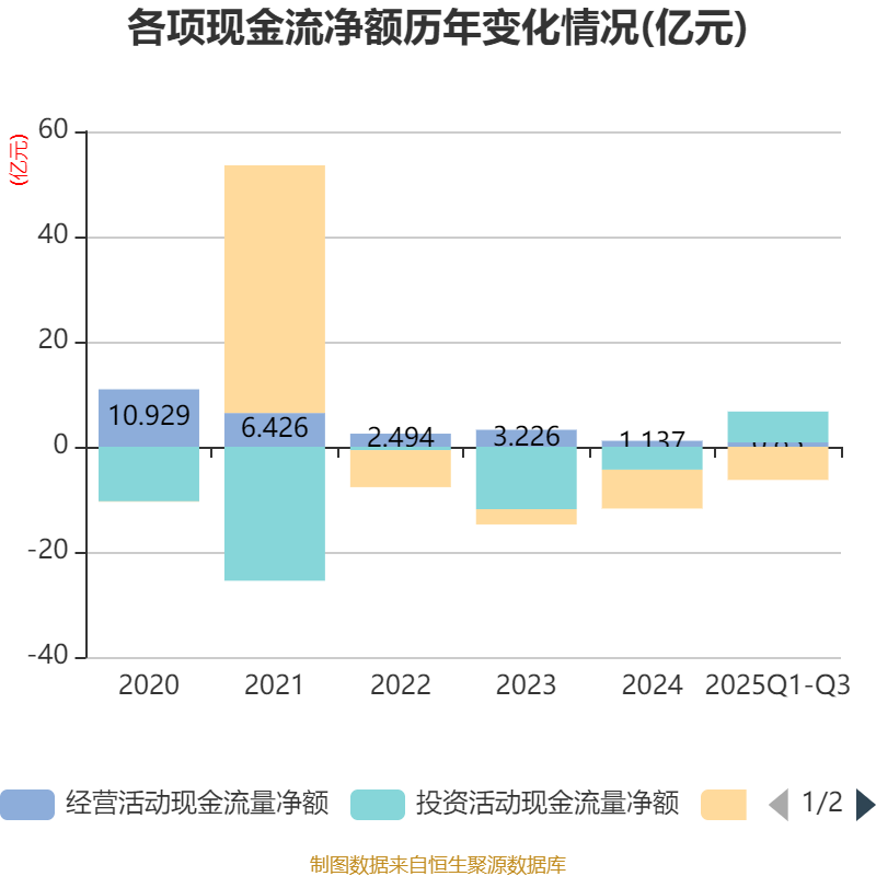 2025年前三季度,公司经营活动现金流净额为8299.14万元,同比增长11.22%;筹资活动现金流净额-6.31亿元,同比增加9440.6万元;投资活动现金流净额5.88亿元,上年同期为1.82亿元。