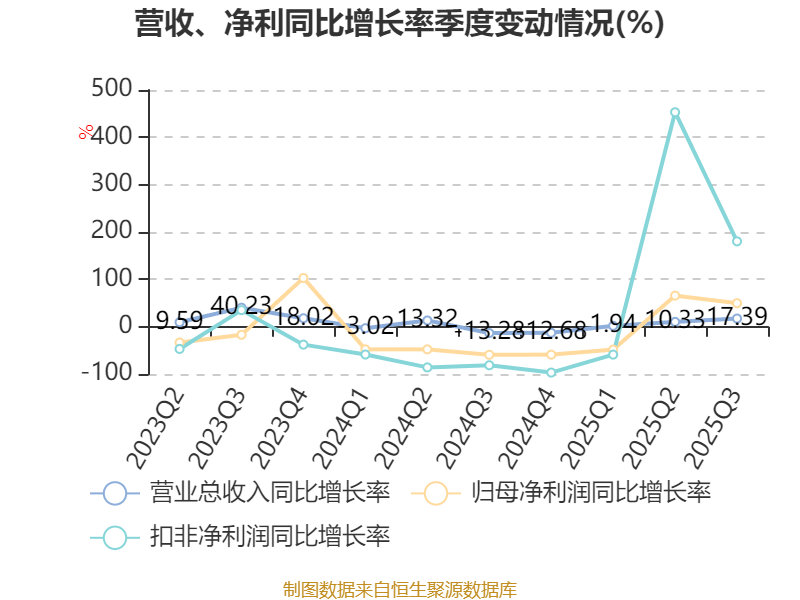 资产重大变化方面,截至2025年三季度末,公司交易性金融资产合计较上年末减少23.2%,占公司总资产比重下降9.27个百分点;货币资金较上年末增加74.69%,占公司总资产比重上升3.59个百分点;其他非流动金融资产较上年末增加40.26%,占公司总资产比重上升2.08个百分点;在建工程合计较上年末增加87.29%,占公司总资产比重上升0.79个百分点。