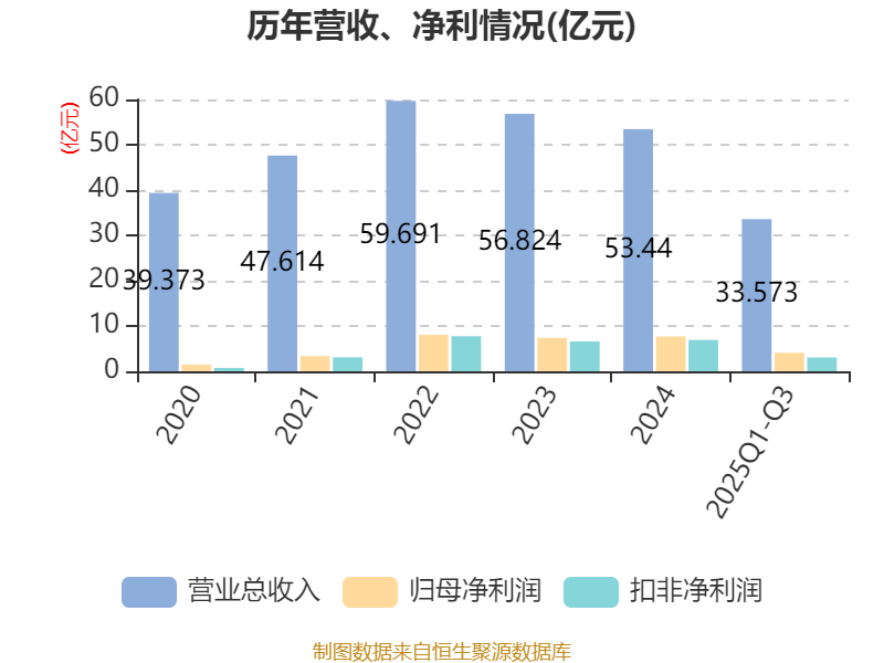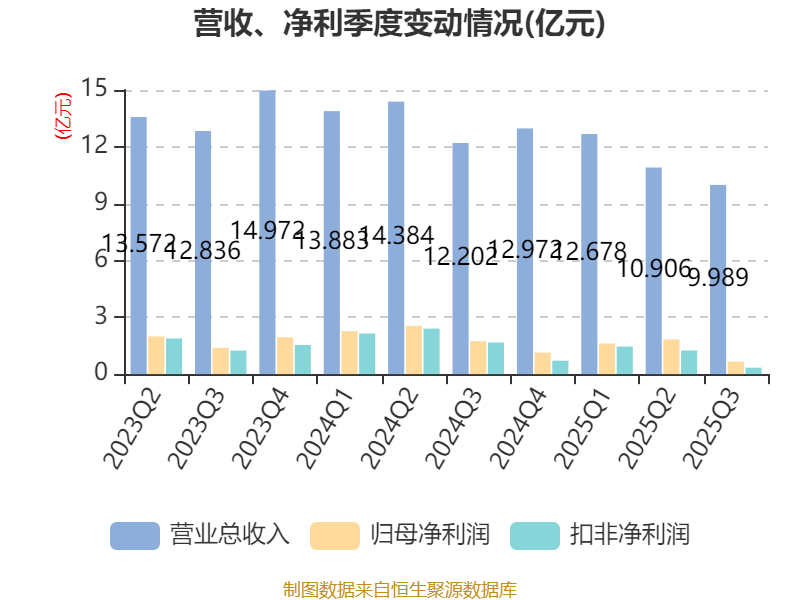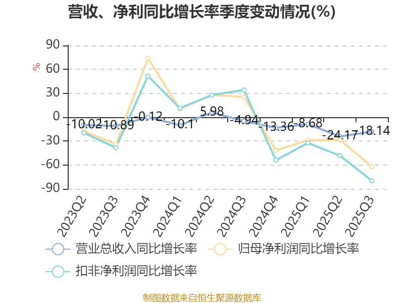 中证智能财讯苏盐井神(603299)10月28日披露2025年第三季度报告。前三季度公司实现营业总收入33.57亿元,同比下降17.04%;归母净利润4.1亿元,同比下降37.46%;扣非净利润3.04亿元,同比下降51.11%;经营活动产生的现金流量净额为1.77亿元,同比下降82.87%;报告期内,苏盐井神基本每股收益为0.5244元,加权平均净资产收益率为6.72%。
