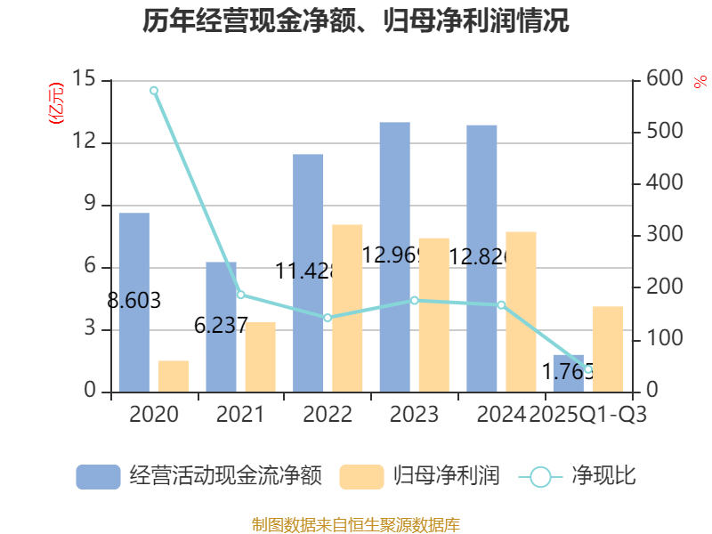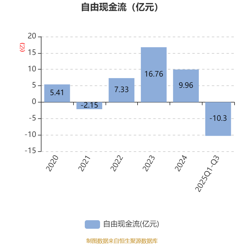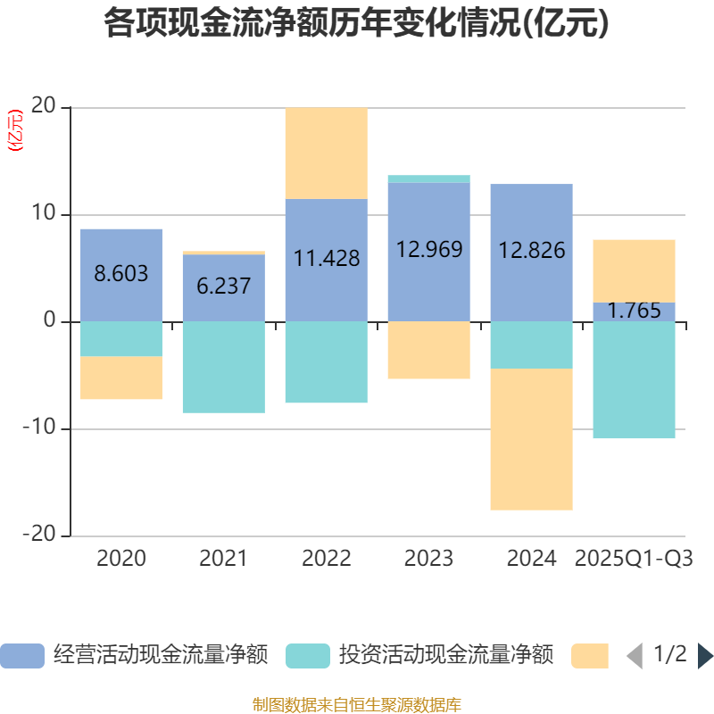 2025年前三季度,公司经营活动现金流净额为1.77亿元,同比下降82.87%;筹资活动现金流净额5.84亿元,同比增加11.38亿元;投资活动现金流净额-10.92亿元,上年同期为-1.7亿元。