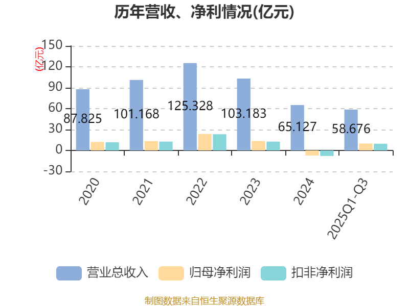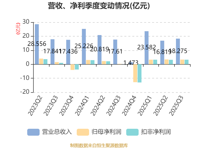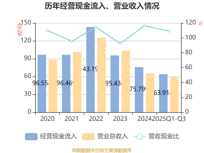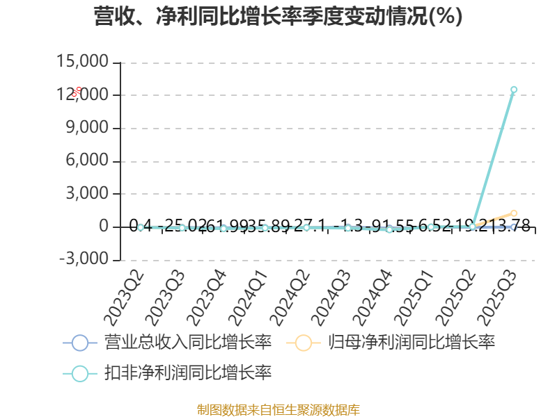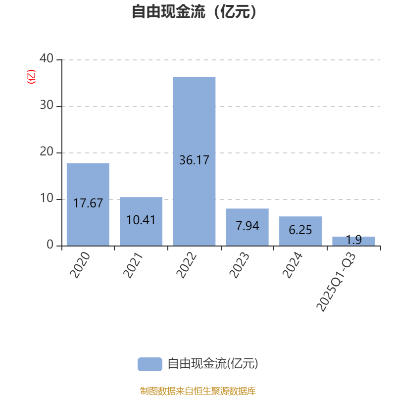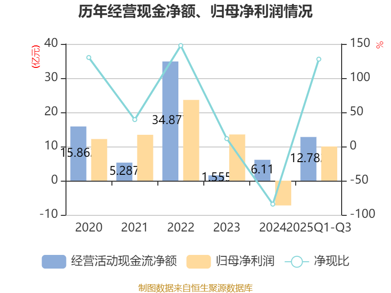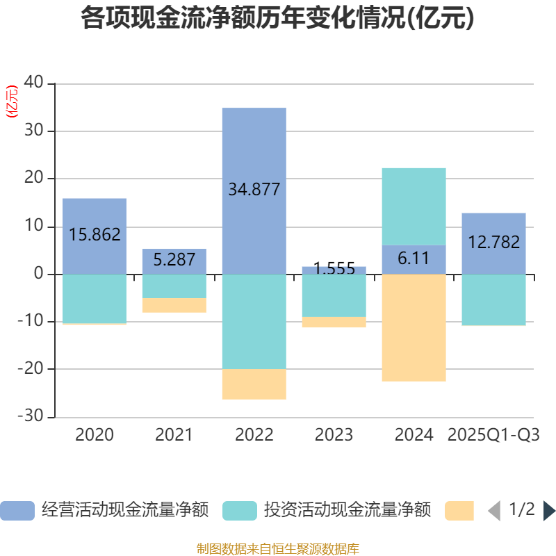 2025年前三季度,公司经营活动现金流净额为12.78亿元,同比增长296.19%;筹资活动现金流净额-730.72万元,同比增加3.01亿元;投资活动现金流净额-10.81亿元,上年同期为-11.57万元。