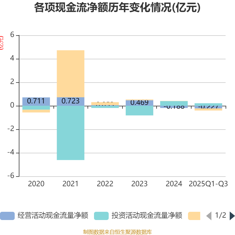 2025年前三季度,公司经营活动现金流净额为-2269.04万元,同比减少885.09万元;筹资活动现金流净额-1792.83万元,同比减少2364.86万元;投资活动现金流净额2124.31万元,上年同期为3974.64万元。