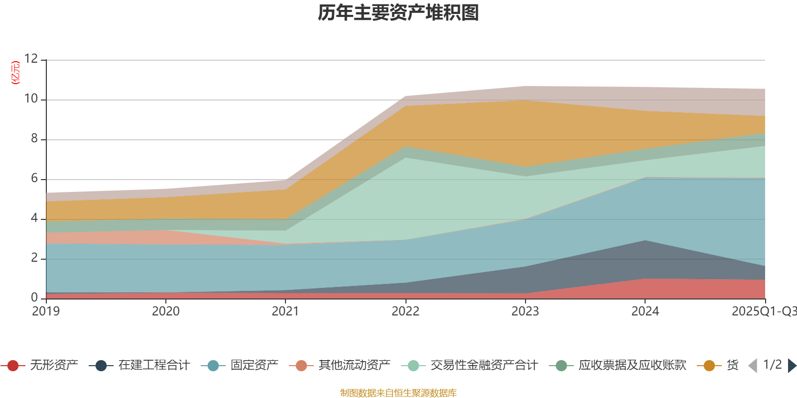 资产重大变化方面,截至2025年三季度末,公司固定资产较上年末增加40.55%,占公司总资产比重上升12.39个百分点;在建工程合计较上年末减少64.09%,占公司总资产比重下降11.57个百分点;货币资金较上年末减少55.27%,占公司总资产比重下降9.85个百分点;交易性金融资产合计较上年末增加86.7%,占公司总资产比重上升7.06个百分点。