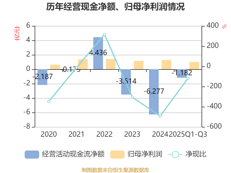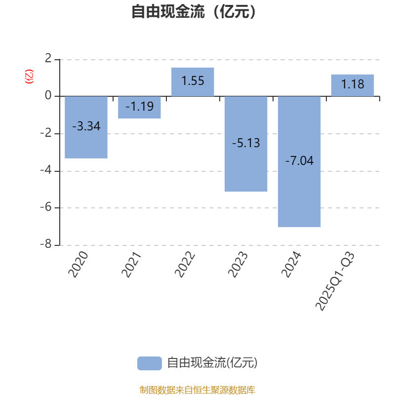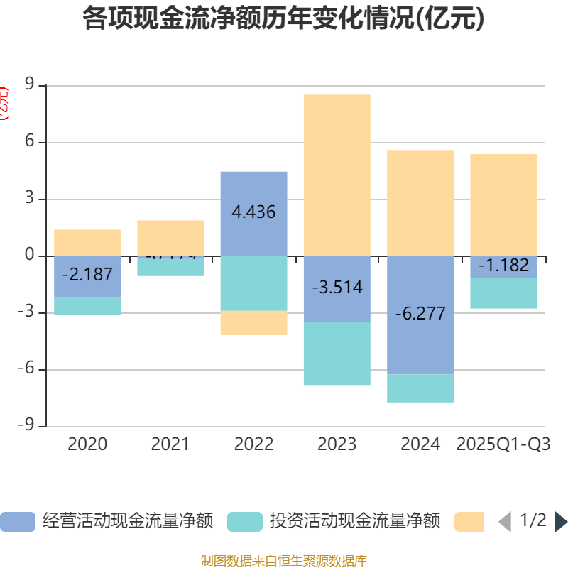 2025年前三季度,公司经营活动现金流净额为-1.18亿元,同比增加4.73亿元;筹资活动现金流净额5.37亿元,同比减少7861.9万元;投资活动现金流净额-1.62亿元,上年同期为-1.86亿元。