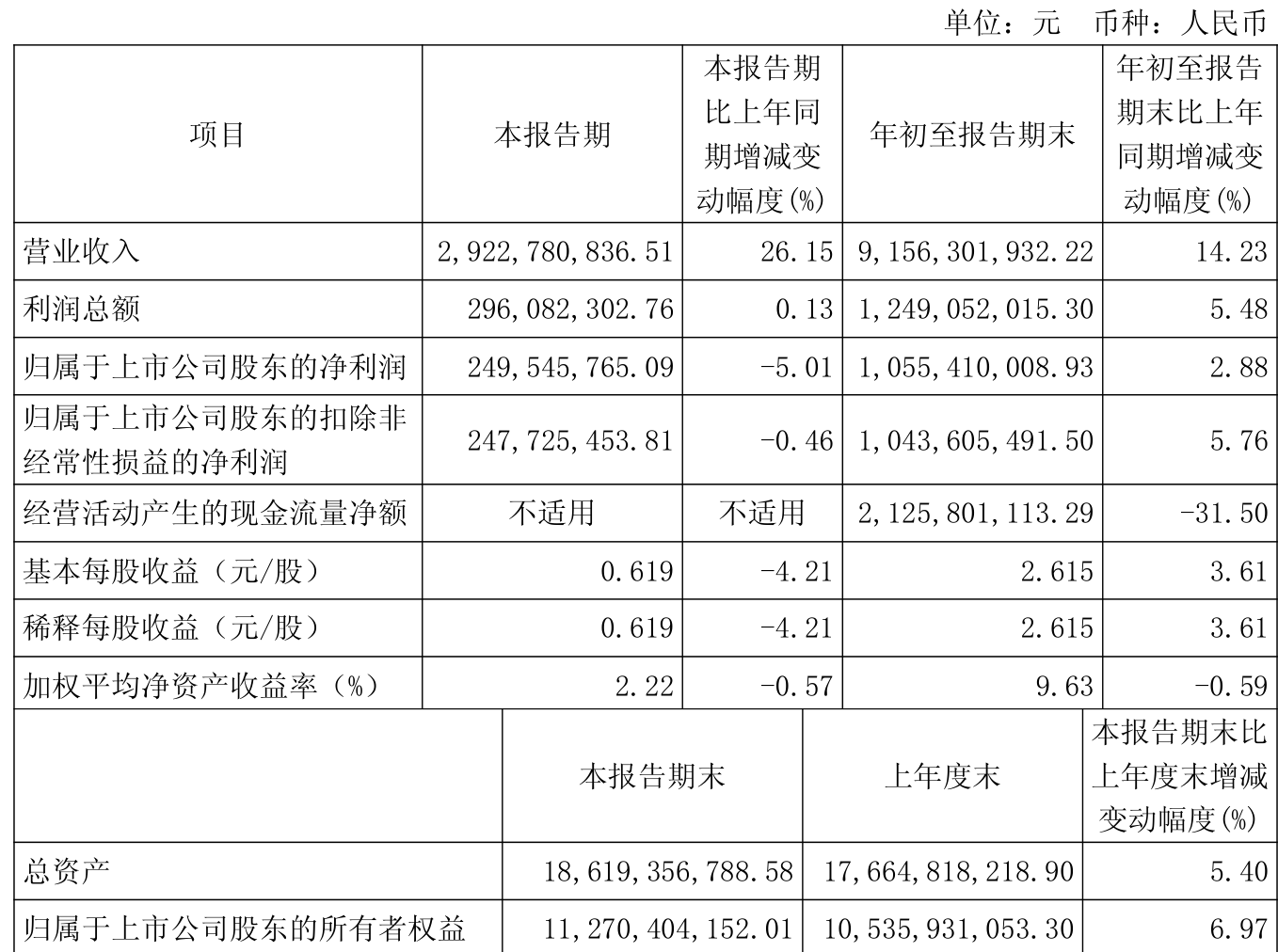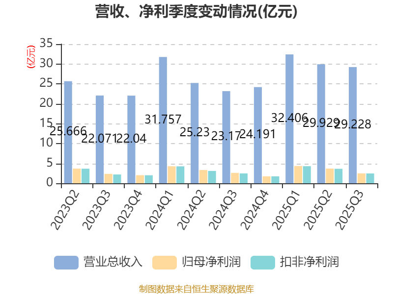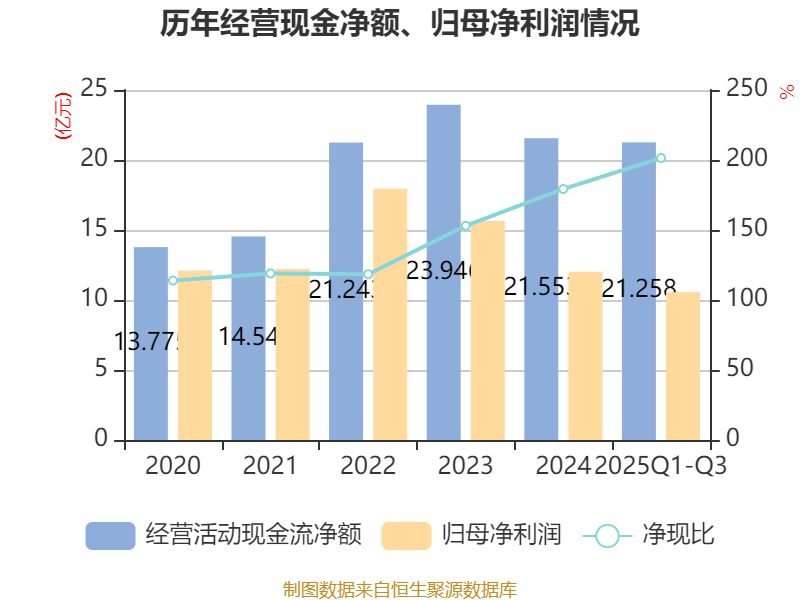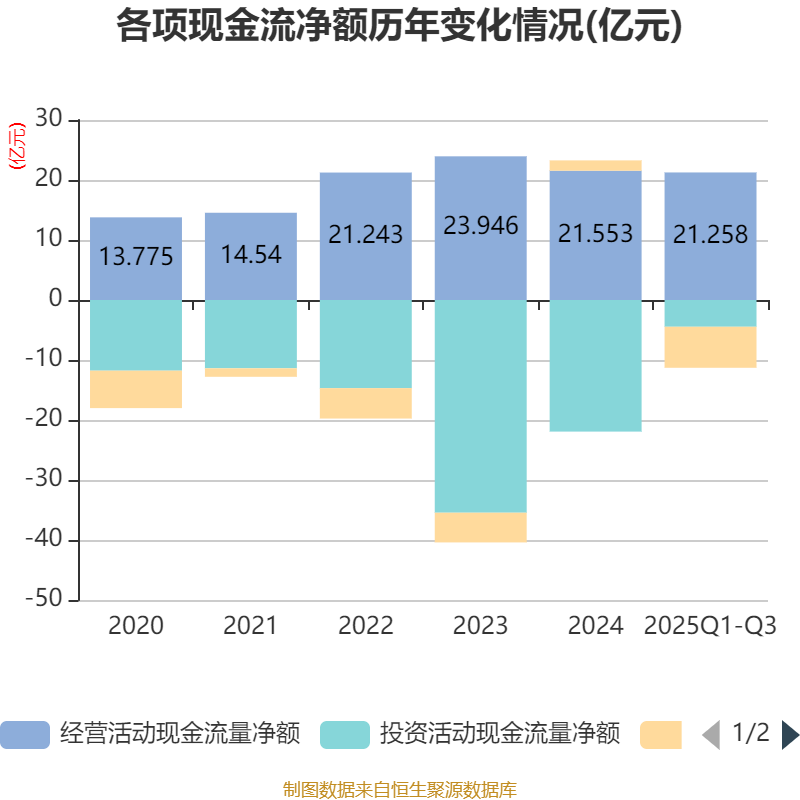 2025年前三季度,公司经营活动现金流净额为21.26亿元,同比下降31.5%;筹资活动现金流净额-6.84亿元,同比减少2.21亿元;投资活动现金流净额-4.46亿元,上年同期为-16.88亿元。