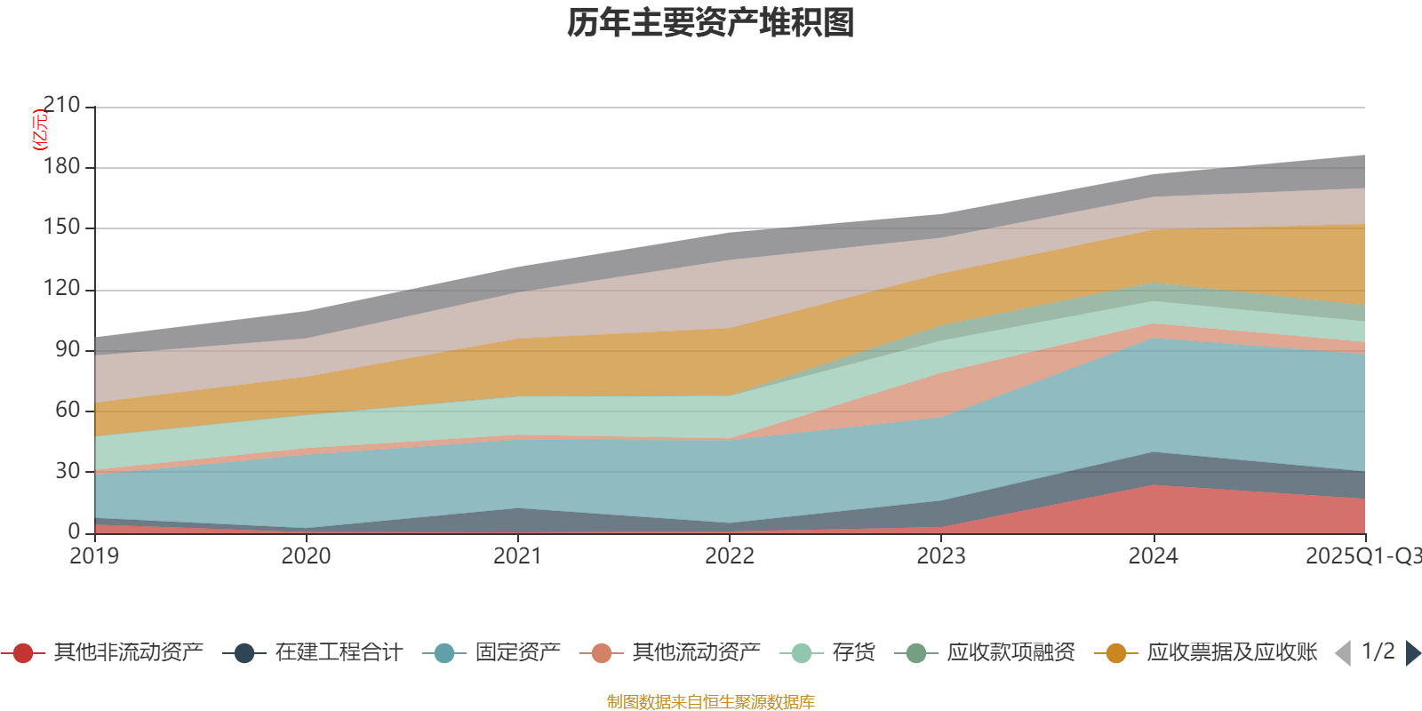 资产重大变化方面,截至2025年三季度末,公司应收票据及应收账款较上年末增加54.27%,占公司总资产比重上升6.81个百分点;其他非流动资产较上年末减少28.83%,占公司总资产比重下降4.39个百分点;一年内到期的非流动资产占公司总资产的2.96%,上年末为0;在建工程合计较上年末减少17.04%,占公司总资产比重下降1.95个百分点。