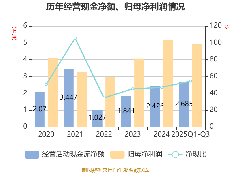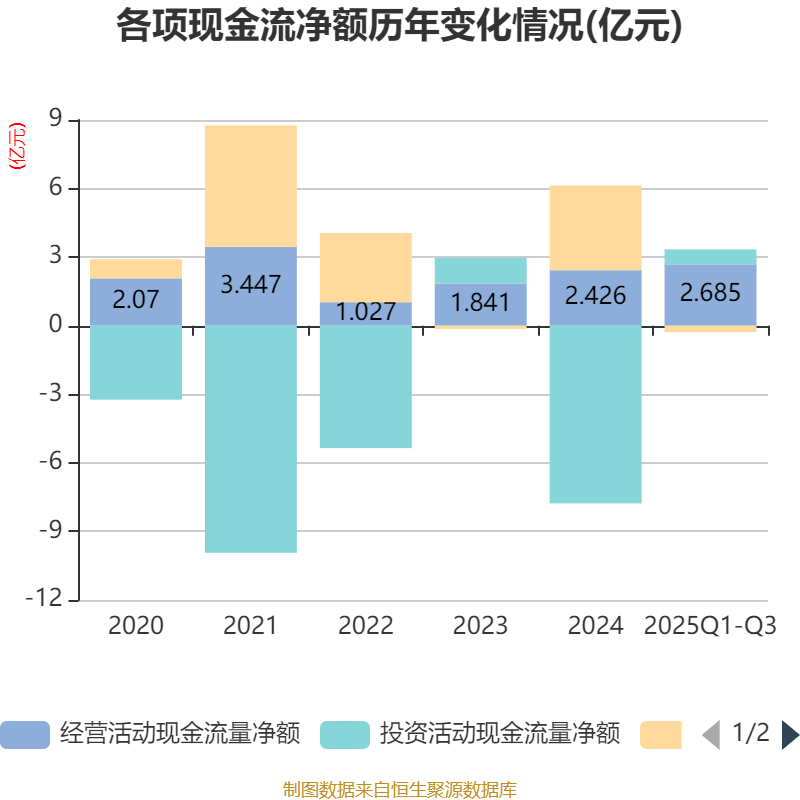 2025年前三季度,公司经营活动现金流净额为2.69亿元,同比下降13.21%;筹资活动现金流净额-2810.66万元,同比减少2.29亿元;投资活动现金流净额6540.7万元,上年同期为-5.5亿元。