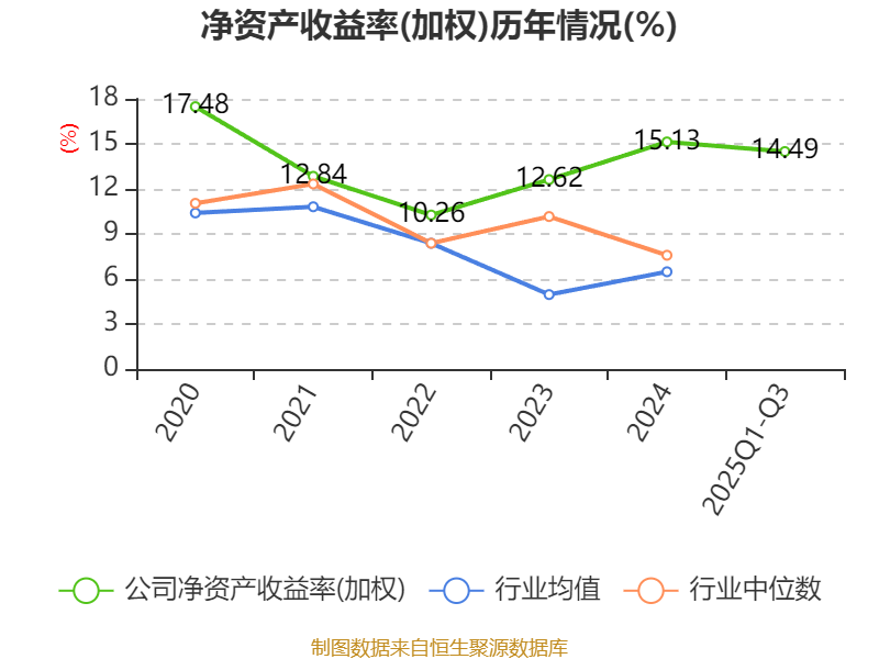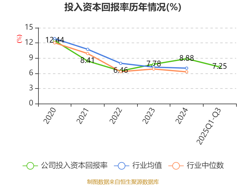盈利能力方面, 2025年前三季度公司加权平均净资产收益率为14.49%,同比上升1.62个百分点。公司2025年前三季度投入资本回报率为7.25%,较上年同期下降0.39个百分点。
