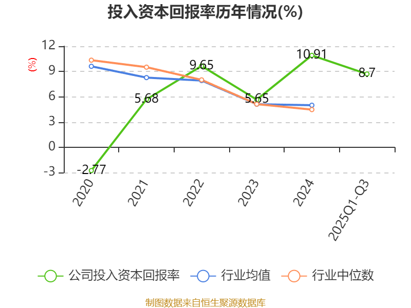 盈利能力方面, 2025年前三季度公司加权平均净资产收益率为10.8%,同比上升2.55个百分点。公司2025年前三季度投入资本回报率为8.7%,较上年同期上升0.52个百分点。