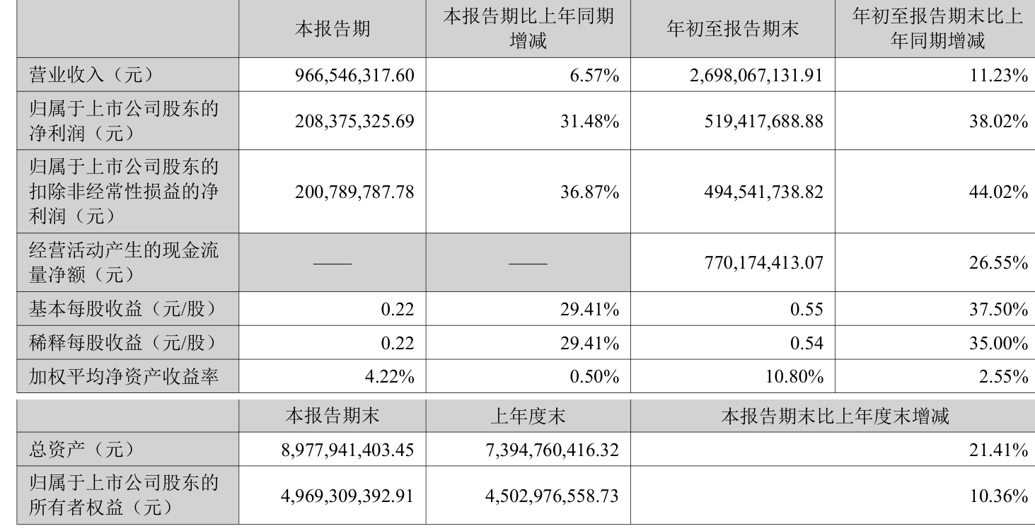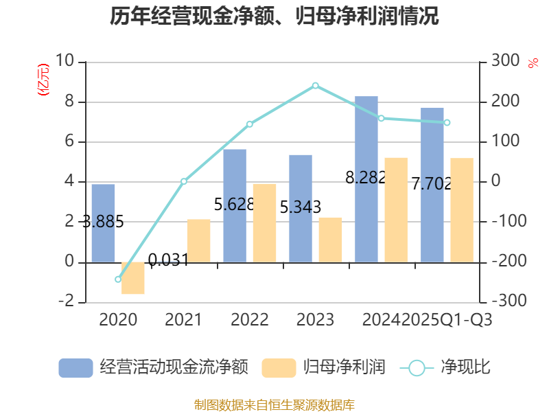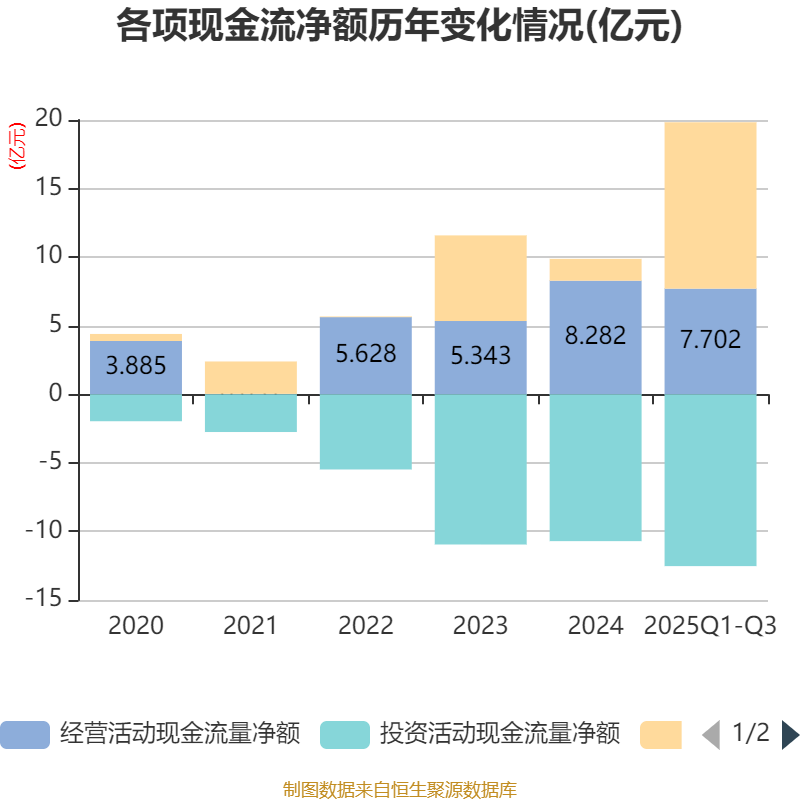 2025年前三季度,公司经营活动现金流净额为7.7亿元,同比增长26.55%;筹资活动现金流净额12.13亿元,同比增加9.9亿元;投资活动现金流净额-12.53亿元,上年同期为-8.67亿元。