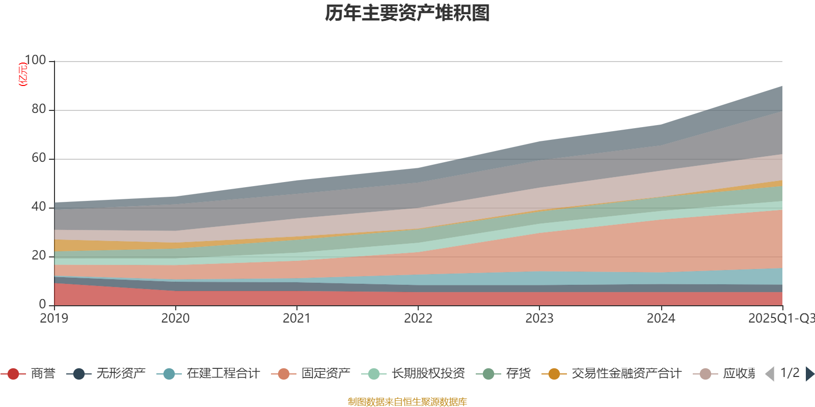 资产重大变化方面,截至2025年三季度末,公司货币资金较上年末增加70.08%,占公司总资产比重上升5.62个百分点;固定资产较上年末增加10.41%,占公司总资产比重下降2.65个百分点;应收票据及应收账款较上年末减少0.43%,占公司总资产比重下降2.6个百分点;交易性金融资产合计较上年末增加1369.93%,占公司总资产比重上升2.46个百分点。