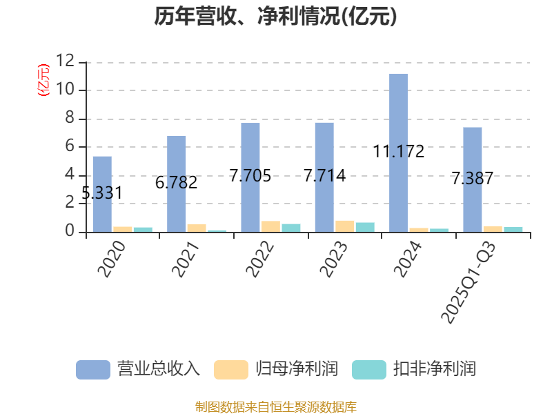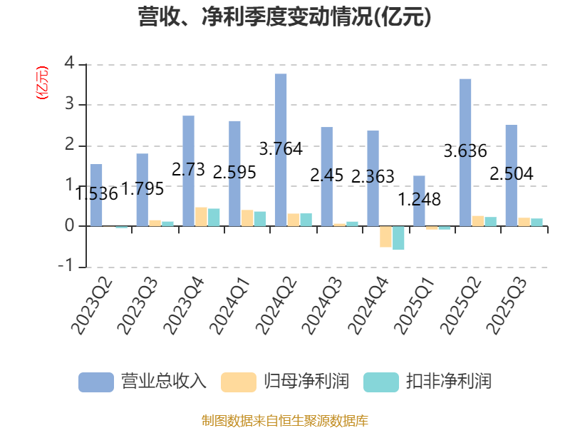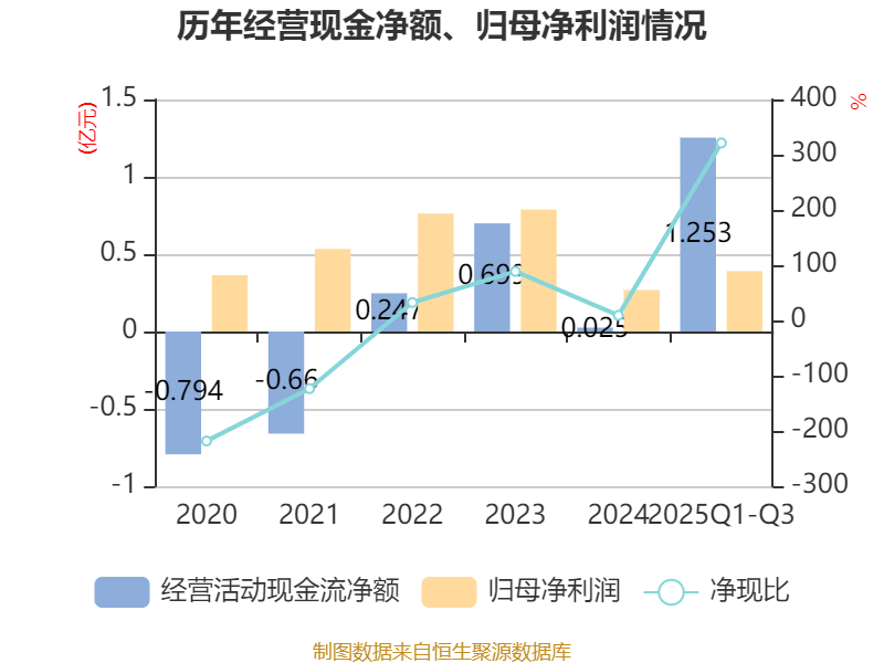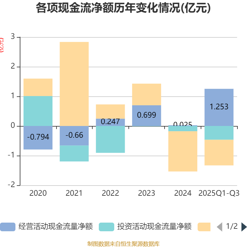 2025年前三季度,公司经营活动现金流净额为1.25亿元,同比增加2.46亿元;筹资活动现金流净额-8650.06万元,同比增加1619.9万元;投资活动现金流净额-4647.7万元,上年同期为-3348.04万元。