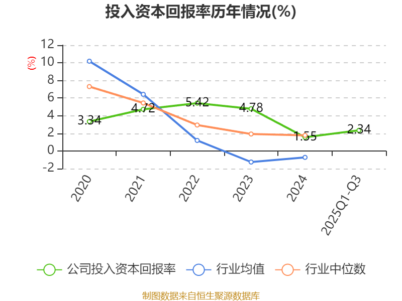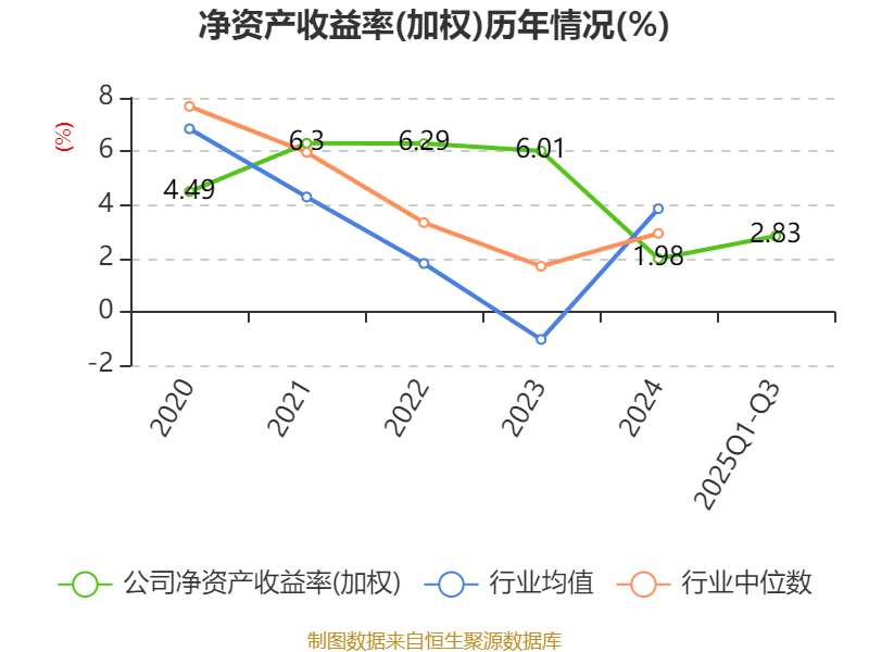 盈利能力方面, 2025年前三季度公司加权平均净资产收益率为2.83%,同比下降2.82个百分点。公司2025年前三季度投入资本回报率为2.34%,较上年同期下降2.56个百分点。