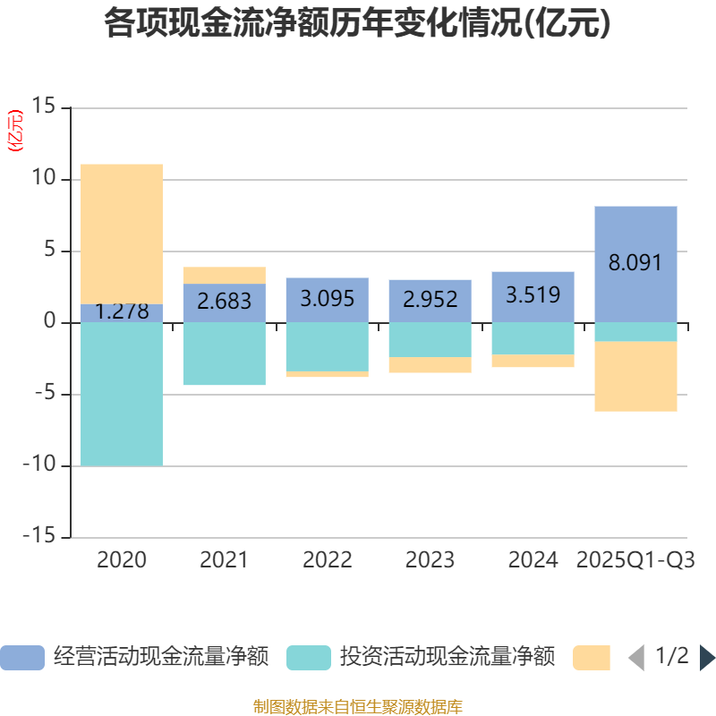 2025年前三季度,公司经营活动现金流净额为8.09亿元,同比增长402.55%;筹资活动现金流净额-4.88亿元,同比减少5.52亿元;投资活动现金流净额-1.36亿元,上年同期为-1.6亿元。
