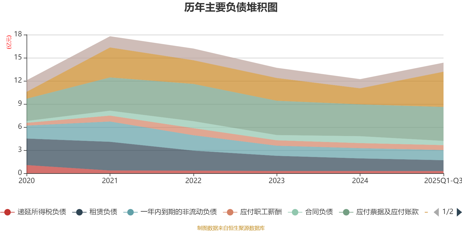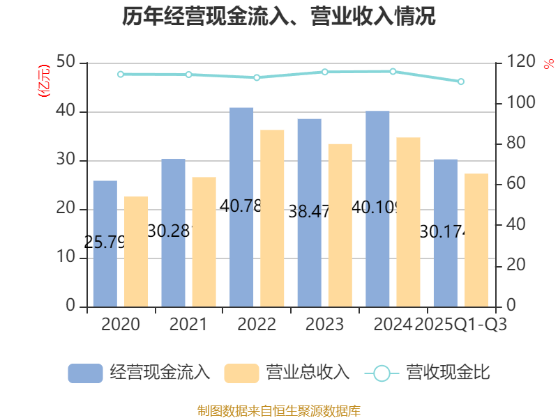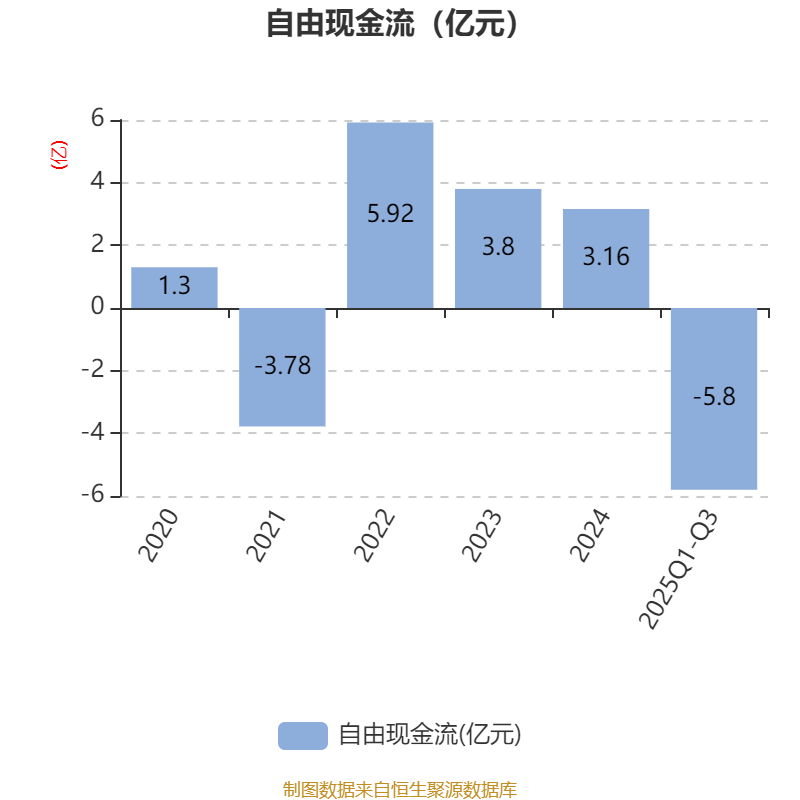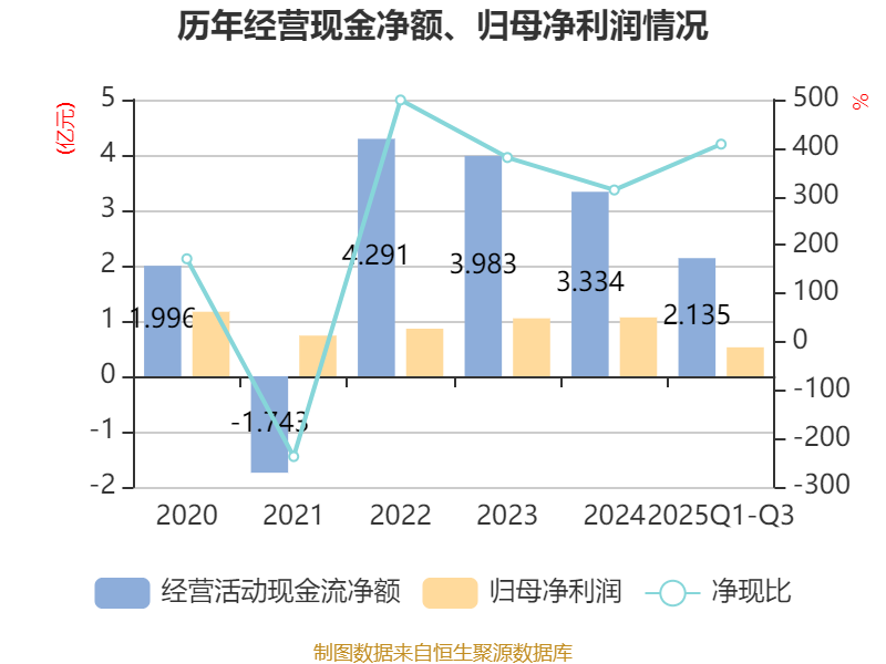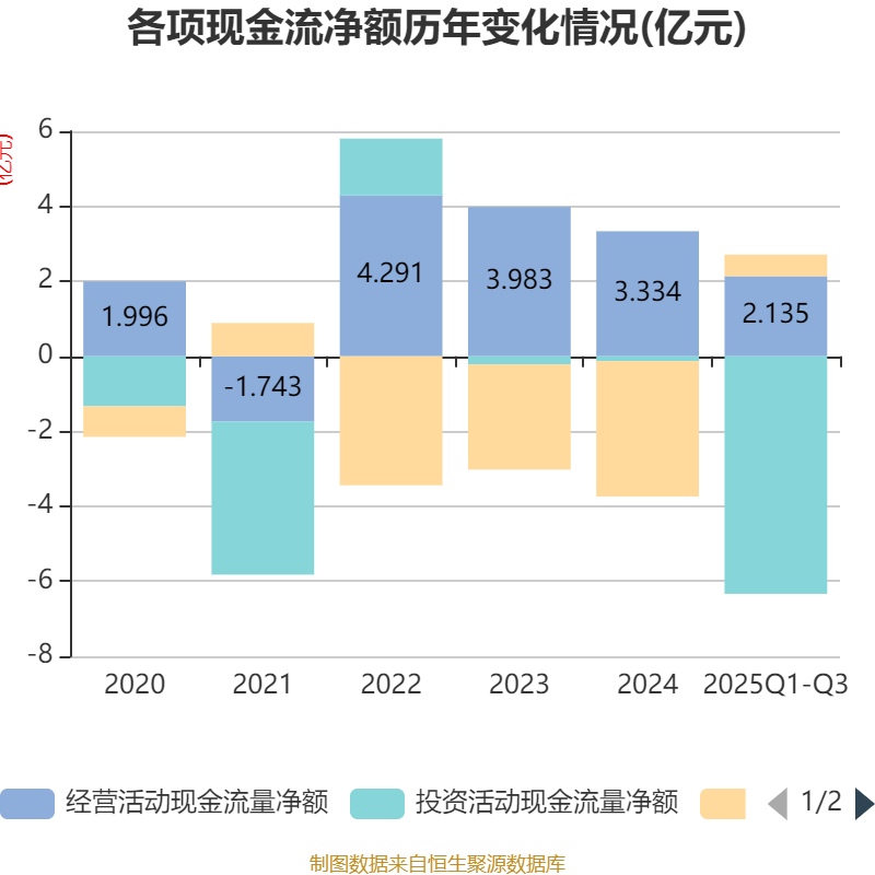 2025年前三季度,公司经营活动现金流净额为2.14亿元,同比增长2.29%;筹资活动现金流净额5759.21万元,同比增加2.23亿元;投资活动现金流净额-6.34亿元,上年同期为-4.81亿元。