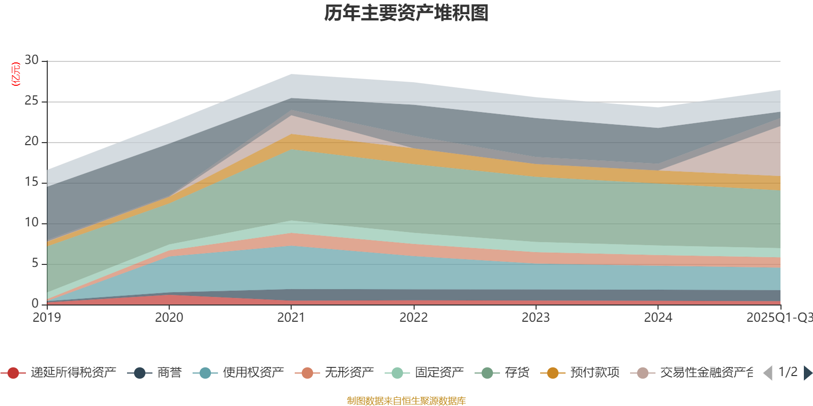 资产重大变化方面,截至2025年三季度末,公司交易性金融资产合计占公司总资产的23.32%,上年末为0;货币资金较上年末减少82.77%,占公司总资产比重下降15.2个百分点;存货较上年末减少6.9%,占公司总资产比重下降4.54个百分点;使用权资产较上年末减少6.28%,占公司总资产比重下降1.69个百分点。