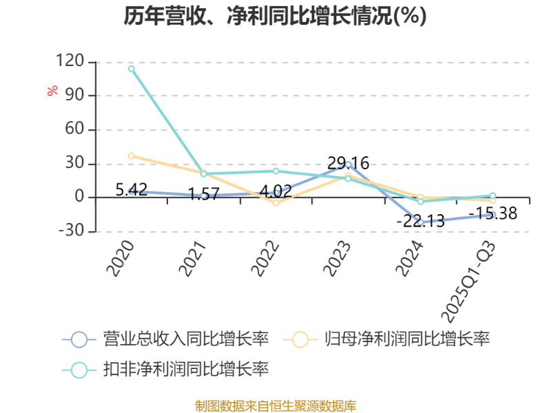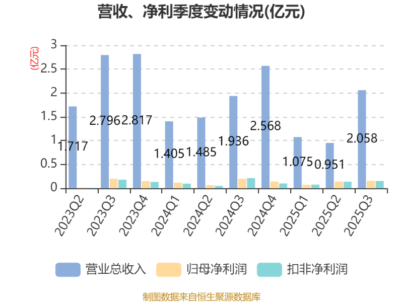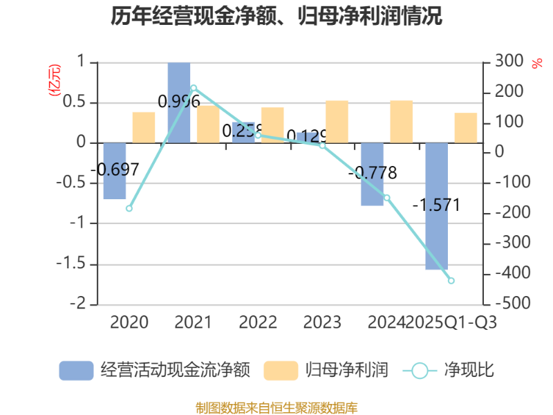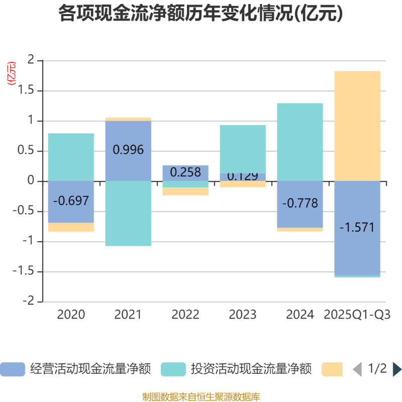 2025年前三季度,公司经营活动现金流净额为-1.57亿元,同比减少6890.11万元;筹资活动现金流净额1.82亿元,同比增加1.98亿元;投资活动现金流净额-297.27万元,上年同期为1.35亿元。