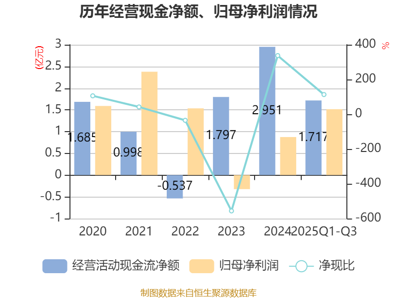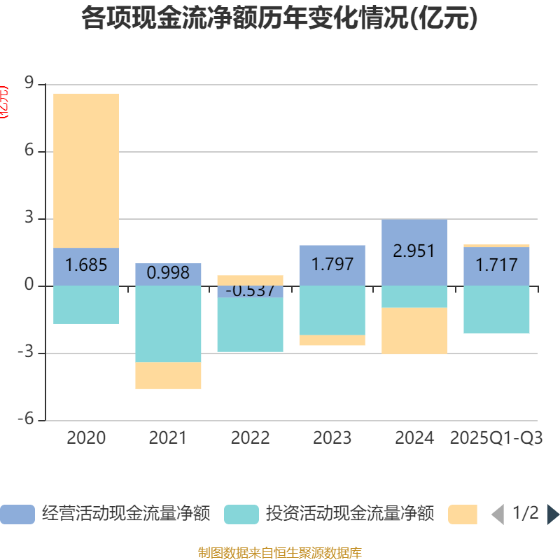 2025年前三季度,公司经营活动现金流净额为1.72亿元,同比下降15.27%;筹资活动现金流净额1207.74万元,同比增加2.06亿元;投资活动现金流净额-2.13亿元,上年同期为-6565.05万元。