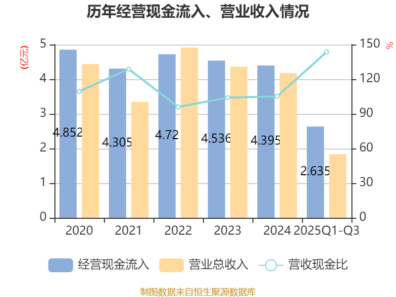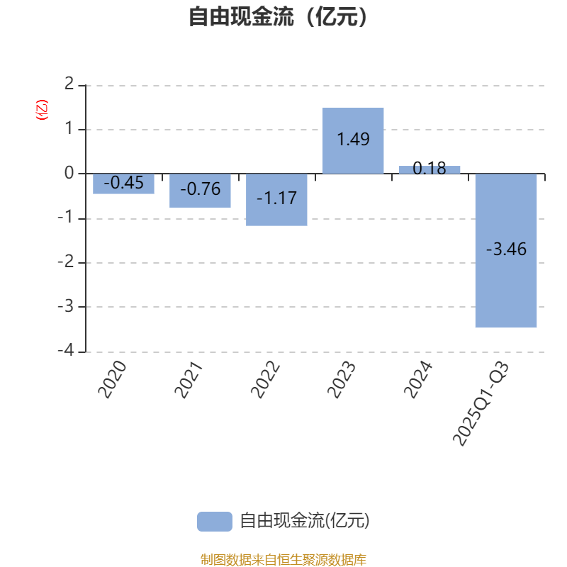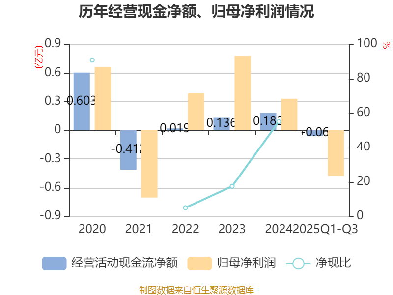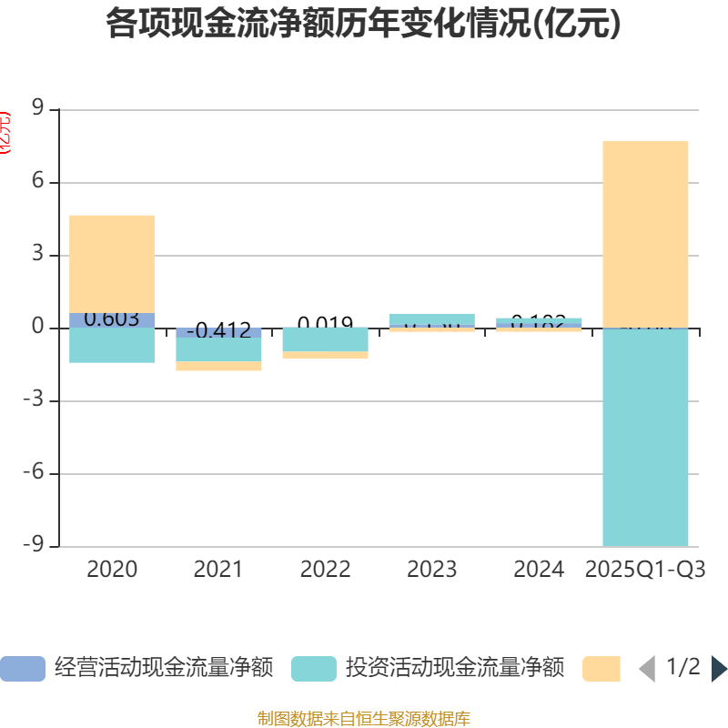 2025年前三季度,公司经营活动现金流净额为-602.31万元,同比减少2627.03万元;筹资活动现金流净额7.68亿元,同比增加7.94亿元;投资活动现金流净额-8.94亿元,上年同期为-3502.71万元。