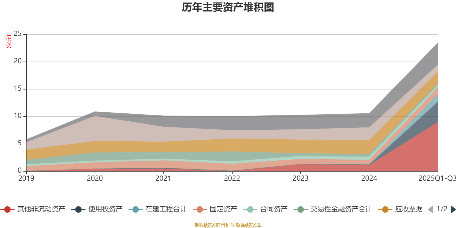 资产重大变化方面,截至2025年三季度末,公司其他非流动资产较上年末增加740.57%,占公司总资产比重上升28.12个百分点;货币资金较上年末减少45%,占公司总资产比重下降16.4个百分点;应收票据及应收账款较上年末减少16.92%,占公司总资产比重下降15.14个百分点;使用权资产较上年末增加2876.02%,占公司总资产比重上升14.51个百分点。