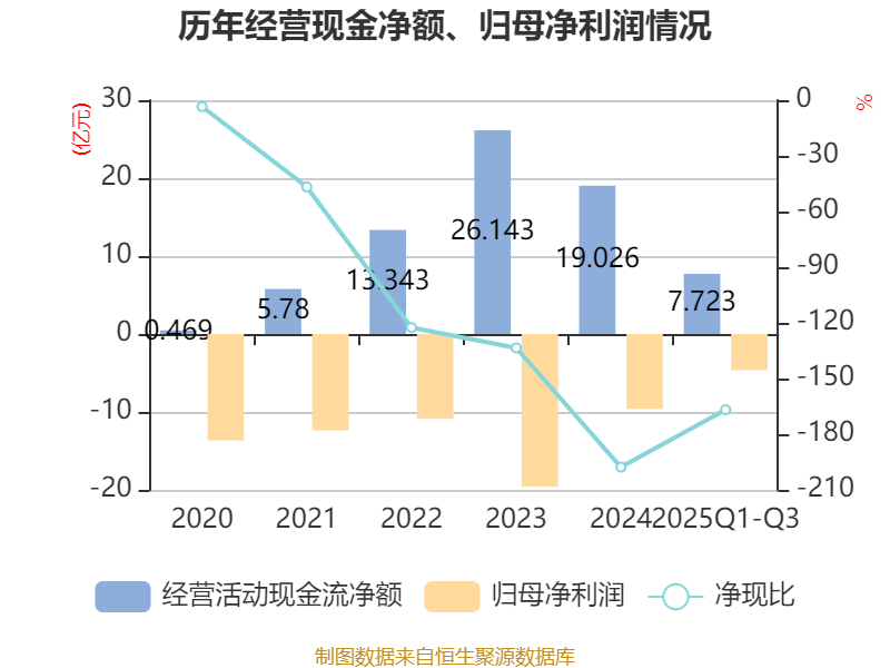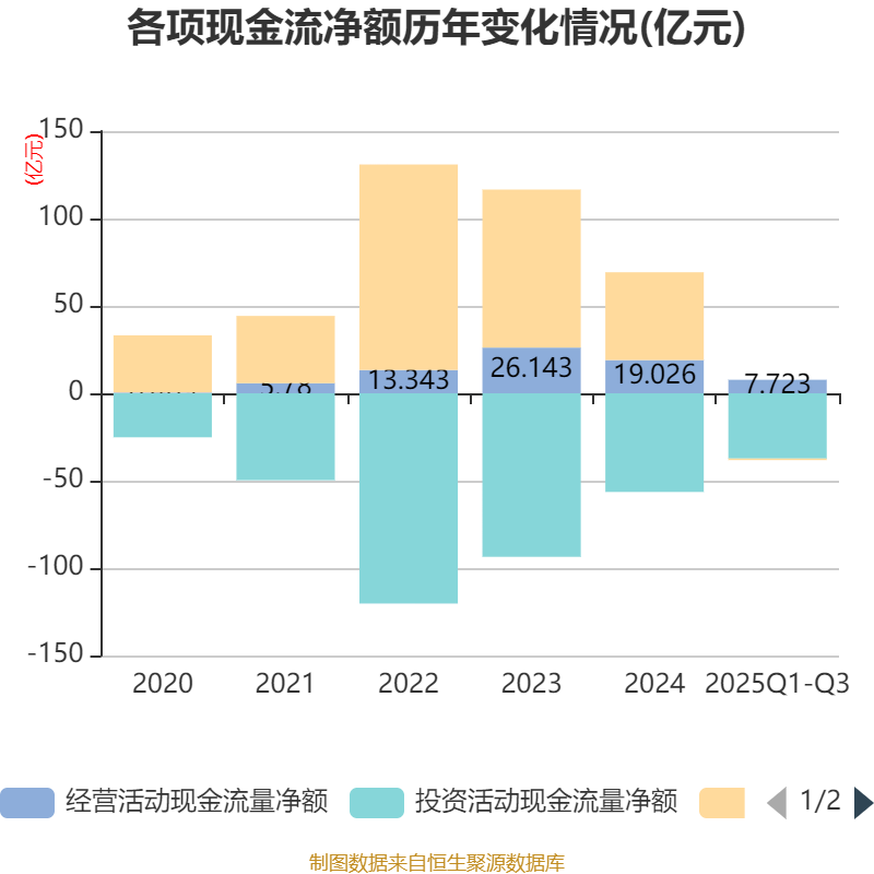 2025年前三季度,公司经营活动现金流净额为7.72亿元,同比下降24.27%;筹资活动现金流净额-8886.03万元,同比减少31.93亿元;投资活动现金流净额-37.33亿元,上年同期为-32.82亿元。