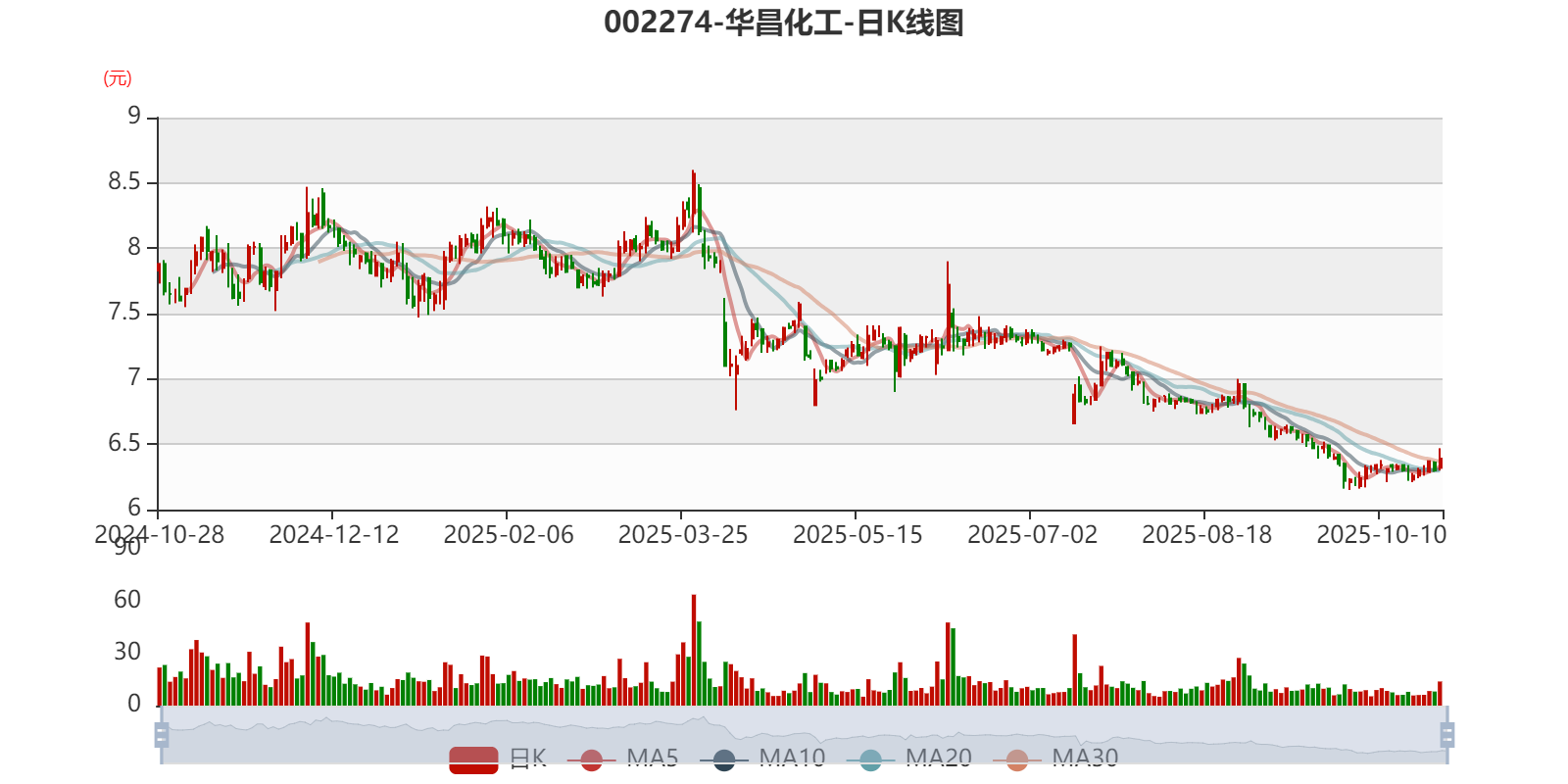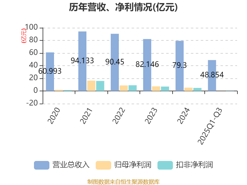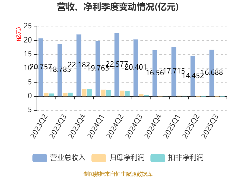 中证智能财讯华昌化工(002274)10月28日披露2025年第三季度报告。前三季度公司实现营业总收入48.85亿元,同比下降22.13%;归母净利润亏损846.56万元,上年同期盈利5.3亿元;扣非净利润亏损2335.97万元,上年同期盈利4.84亿元;经营活动产生的现金流量净额为-2966.49万元,上年同期为3.17亿元;报告期内,华昌化工基本每股收益为-0.0089元,加权平均净资产收益率为-0.15%。