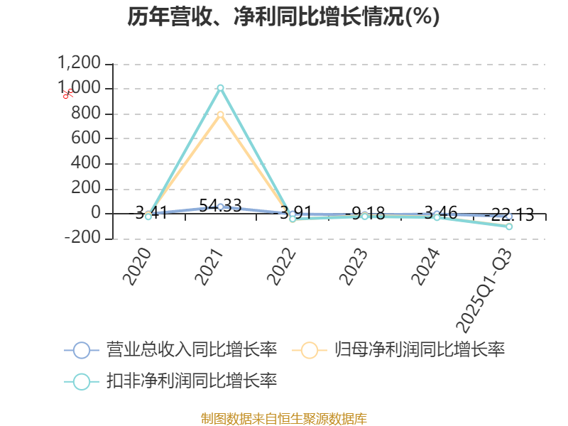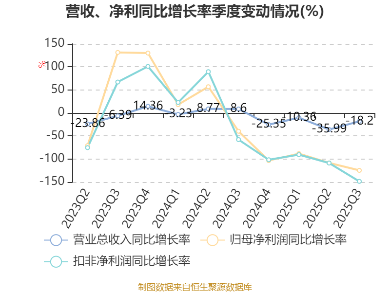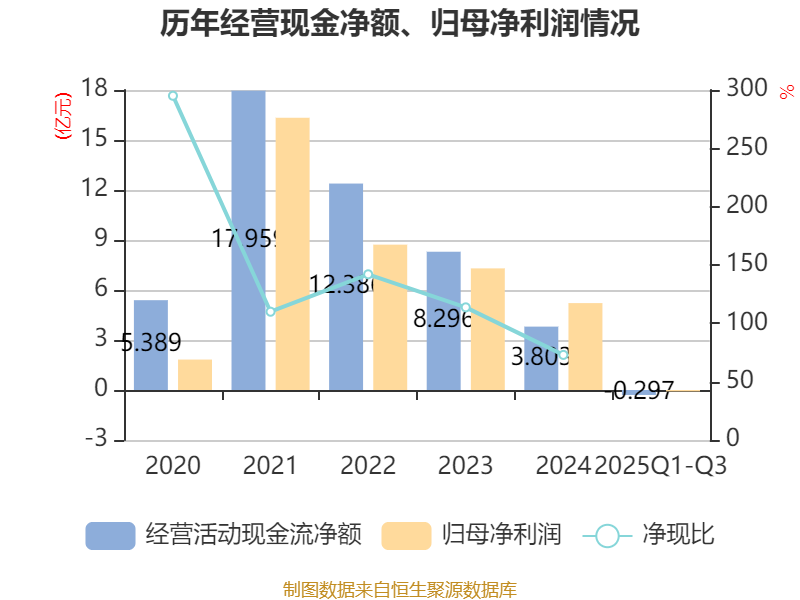 2025年前三季度,公司经营活动现金流净额为-2966.49万元,同比减少3.46亿元;筹资活动现金流净额-839.84万元,同比增加5.5亿元;投资活动现金流净额-4.91亿元,上年同期为1.21亿元。