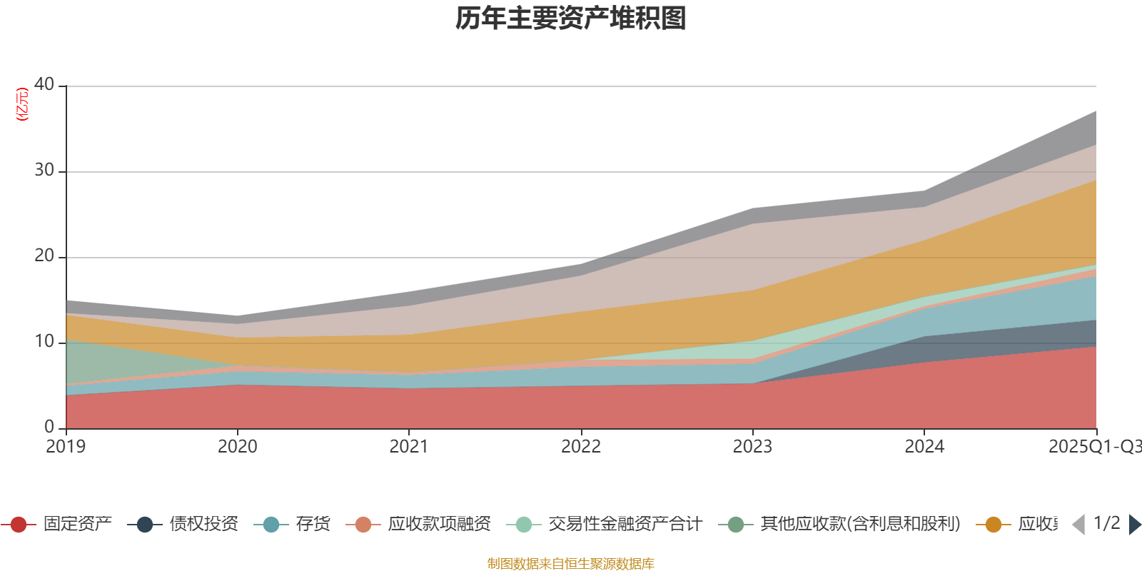 资产重大变化方面,截至2025年三季度末,公司货币资金较上年末增加6.94%,占公司总资产比重下降2.78个百分点;应收票据及应收账款较上年末增加49.23%,占公司总资产比重上升2.78个百分点;在建工程合计较上年末增加445.52%,占公司总资产比重上升2.68个百分点;交易性金融资产合计较上年末减少57.59%,占公司总资产比重下降2.61个百分点。