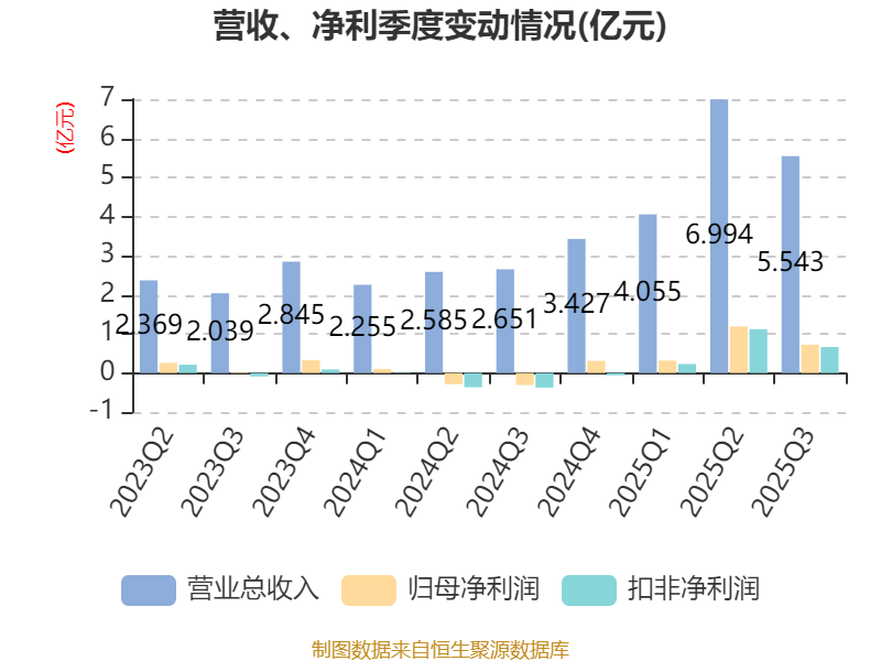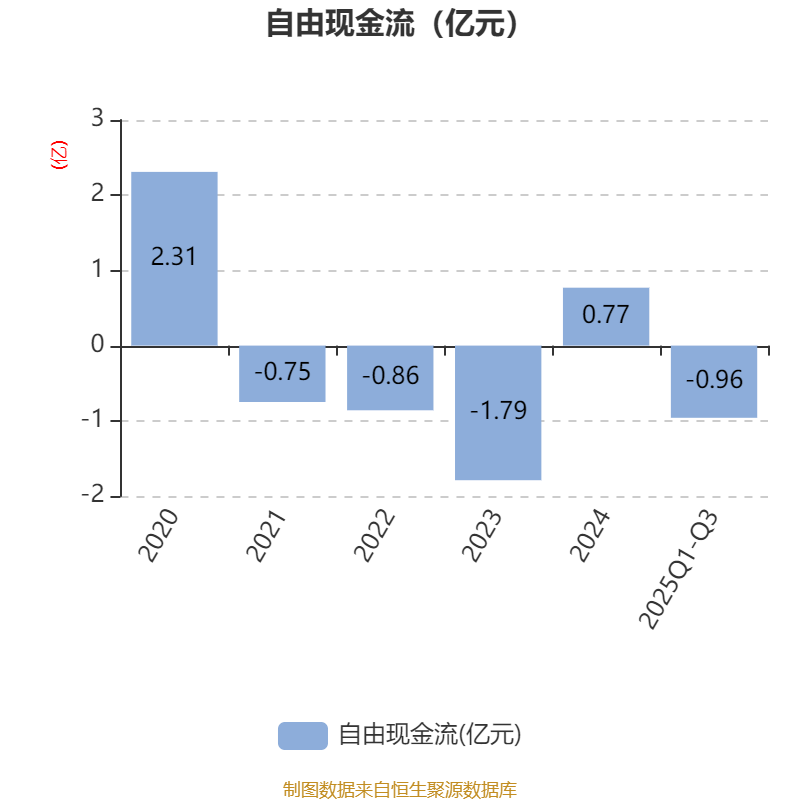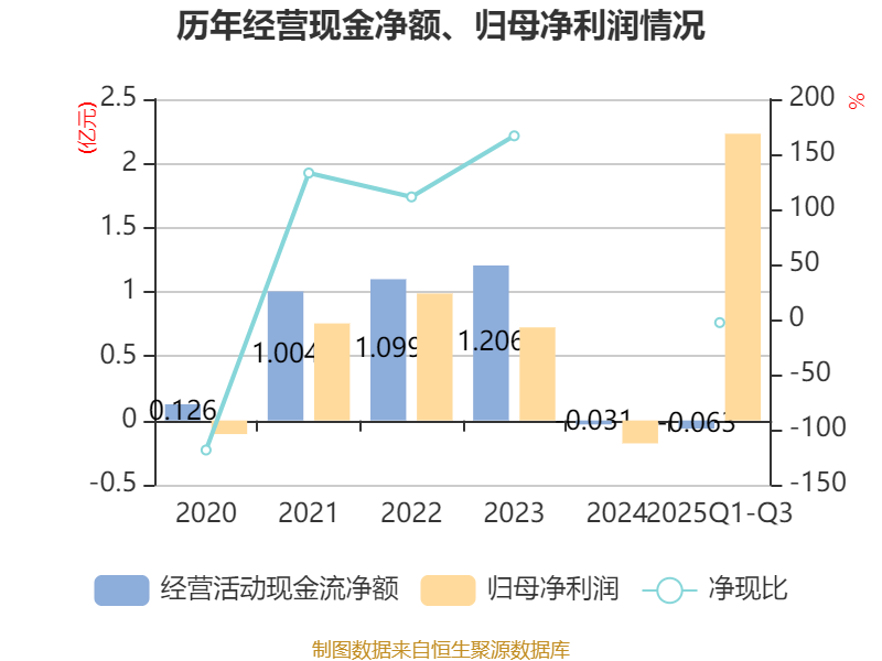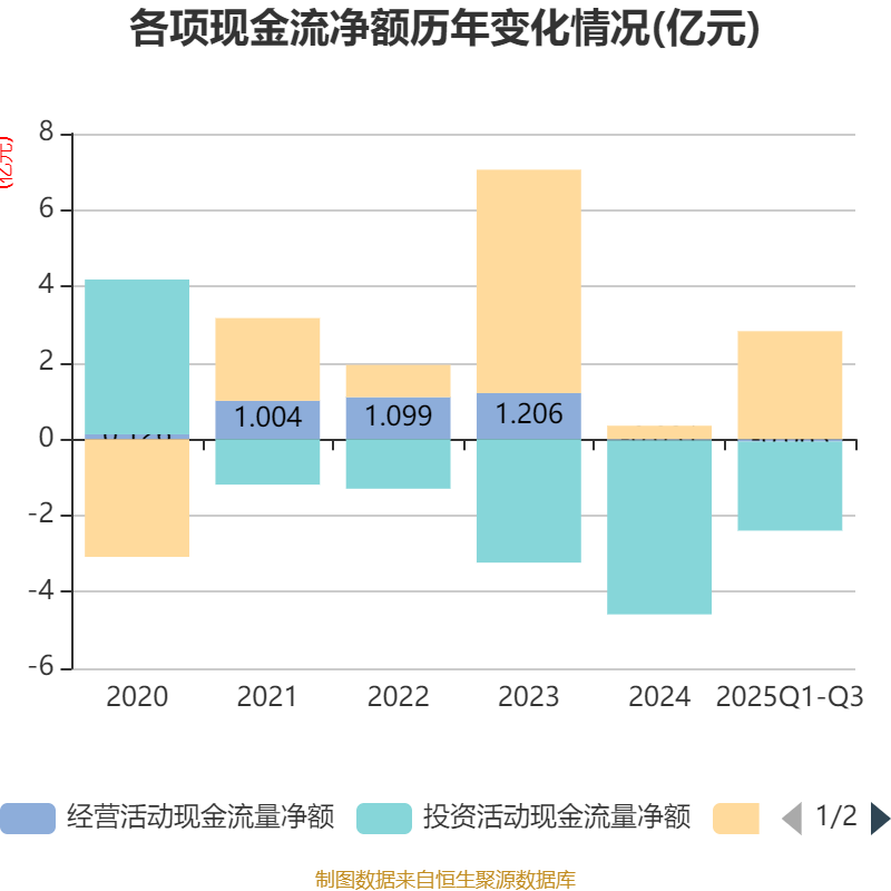 2025年前三季度,公司经营活动现金流净额为-632.56万元,同比增加9523.14万元;筹资活动现金流净额2.83亿元,同比增加2.47亿元;投资活动现金流净额-2.33亿元,上年同期为-3.89亿元。