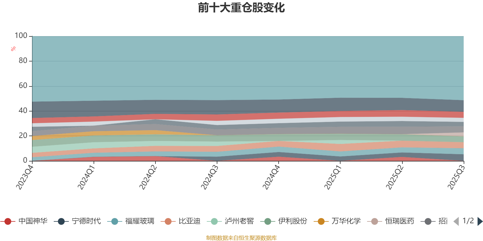 且持股标的较为稳定。截至2025年三季度末,基金十大重仓股分别是贵州茅台、宁德时代、比亚迪、招商银行、中国平安、福耀玻璃、伊利股份、兴业银行、美的集团、恒瑞医药。