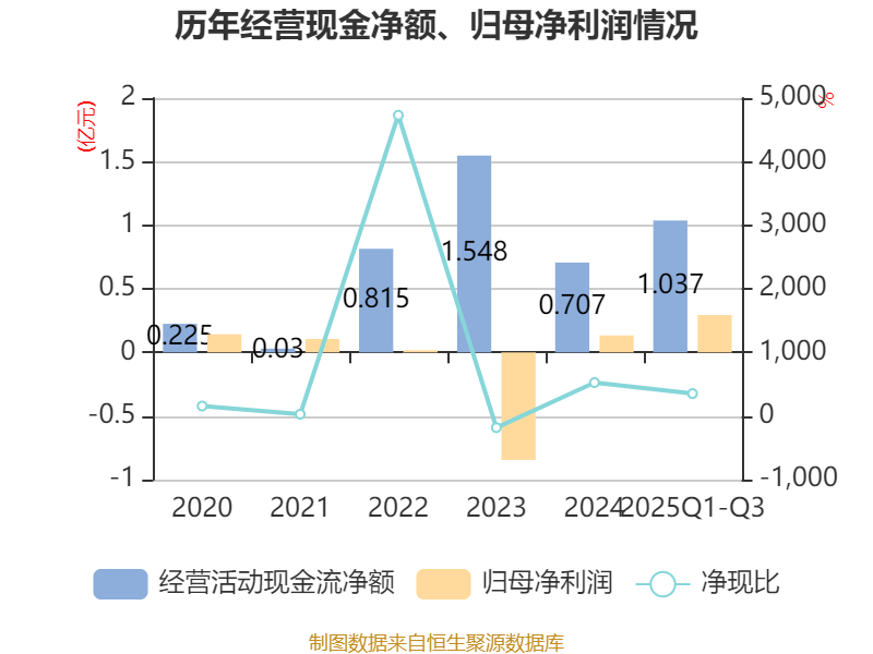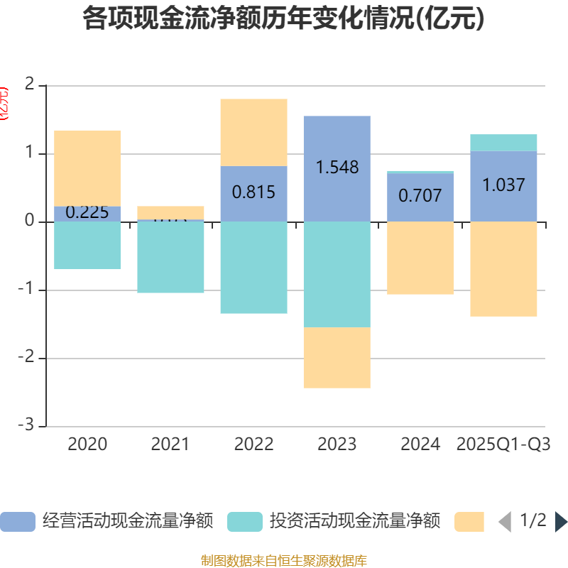 2025年前三季度,公司经营活动现金流净额为1.04亿元,同比增长12.51%;筹资活动现金流净额-1.39亿元,同比增加968.54万元;投资活动现金流净额2434.67万元,上年同期为-3624.81万元。