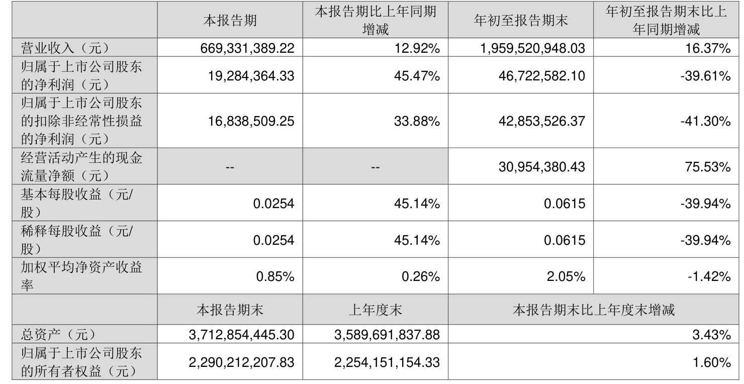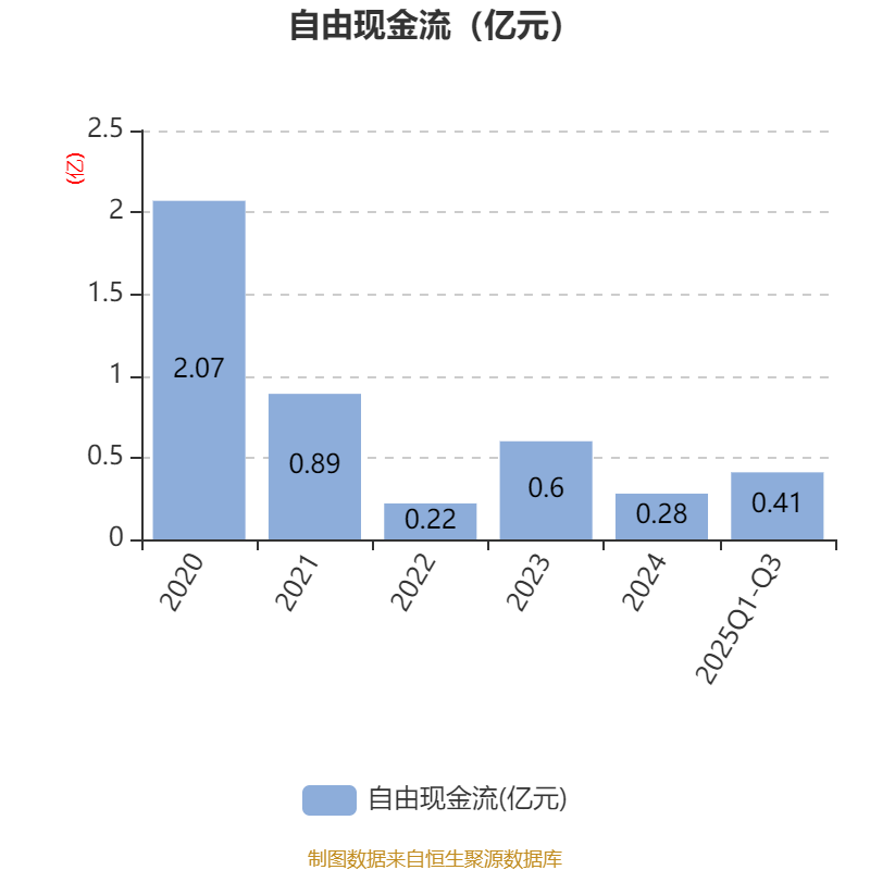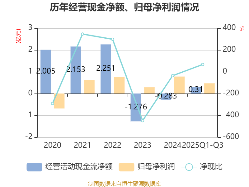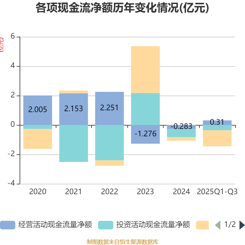 2025年前三季度,公司经营活动现金流净额为3095.44万元,同比增长75.53%;筹资活动现金流净额-1.09亿元,同比减少5738.97万元;投资活动现金流净额-3622.58万元,上年同期为4892.55万元。