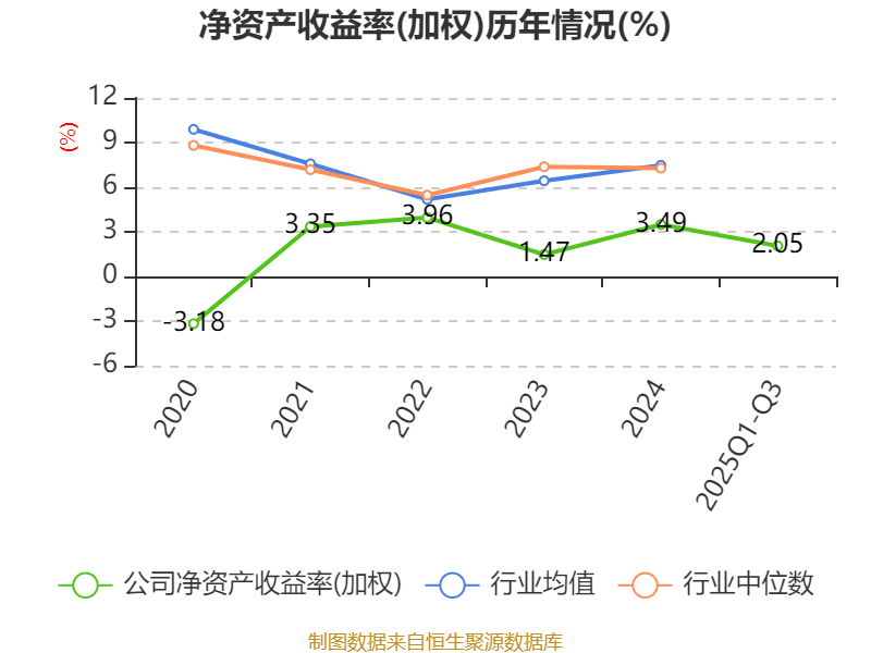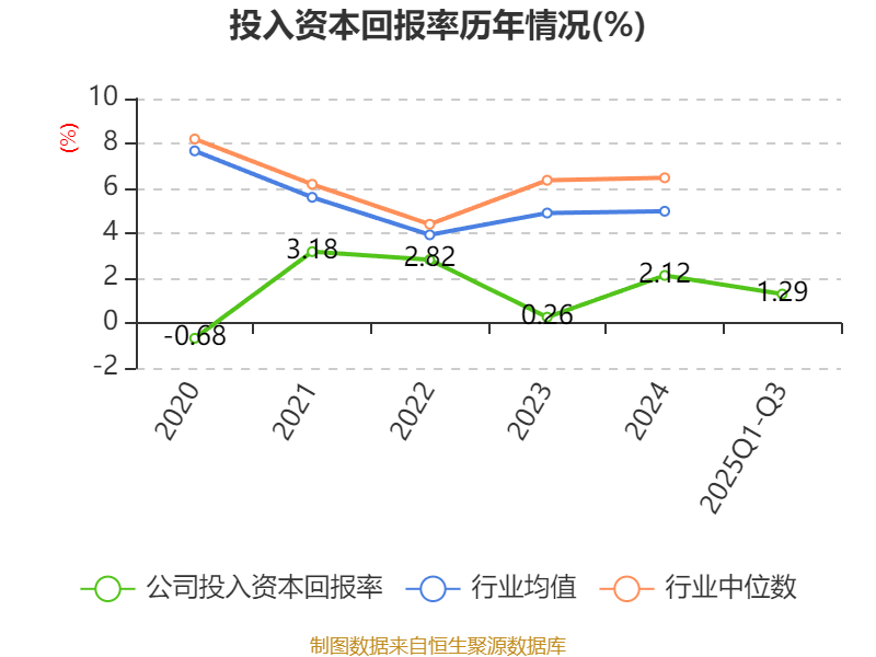 盈利能力方面, 2025年前三季度公司加权平均净资产收益率为2.05%,同比下降1.42个百分点。公司2025年前三季度投入资本回报率为1.29%,较上年同期下降1.09个百分点。