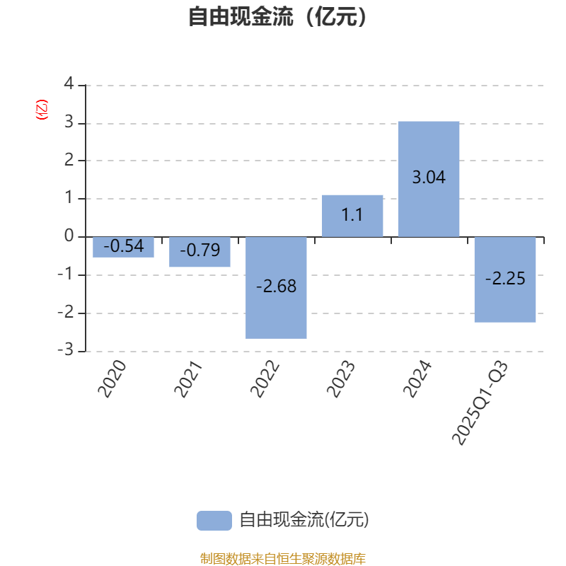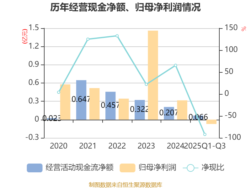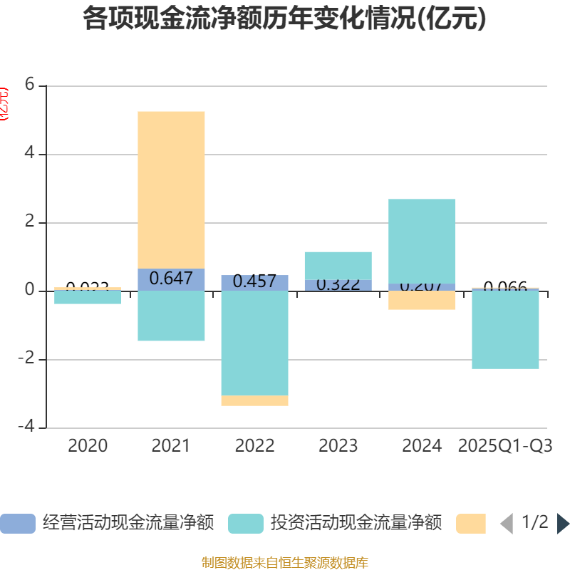 2025年前三季度,公司经营活动现金流净额为662.29万元,同比下降80.32%;筹资活动现金流净额227.79万元,同比增加5487.22万元;投资活动现金流净额-2.29亿元,上年同期为-9741.83万元。
