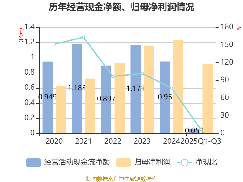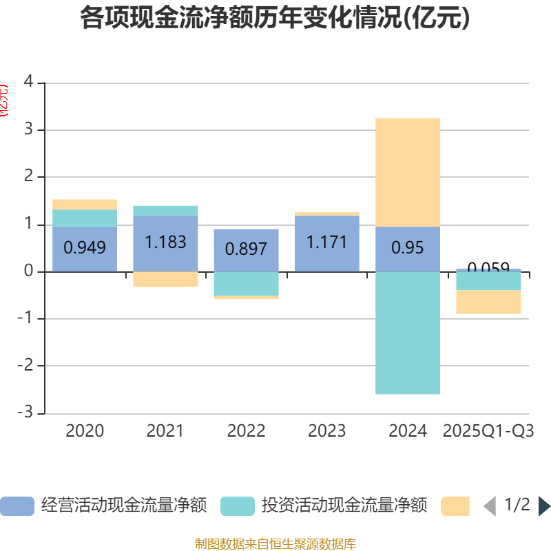 2025年前三季度,公司经营活动现金流净额为593.97万元,同比下降69.38%;筹资活动现金流净额-5001.67万元,同比减少3902.13万元;投资活动现金流净额-3935.26万元,上年同期为-1.79亿元。