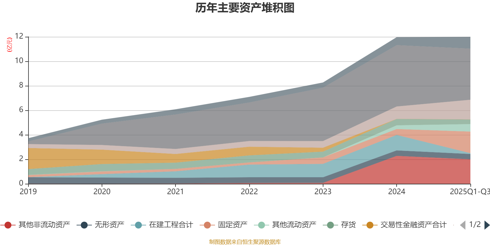 资产重大变化方面,截至2025年三季度末,公司固定资产较上年末增加266.61%,占公司总资产比重上升10.69个百分点;在建工程合计较上年末减少94.79%,占公司总资产比重下降10个百分点;货币资金较上年末减少16.69%,占公司总资产比重下降7.06个百分点;应收票据及应收账款较上年末增加58.28%,占公司总资产比重上升4.94个百分点。