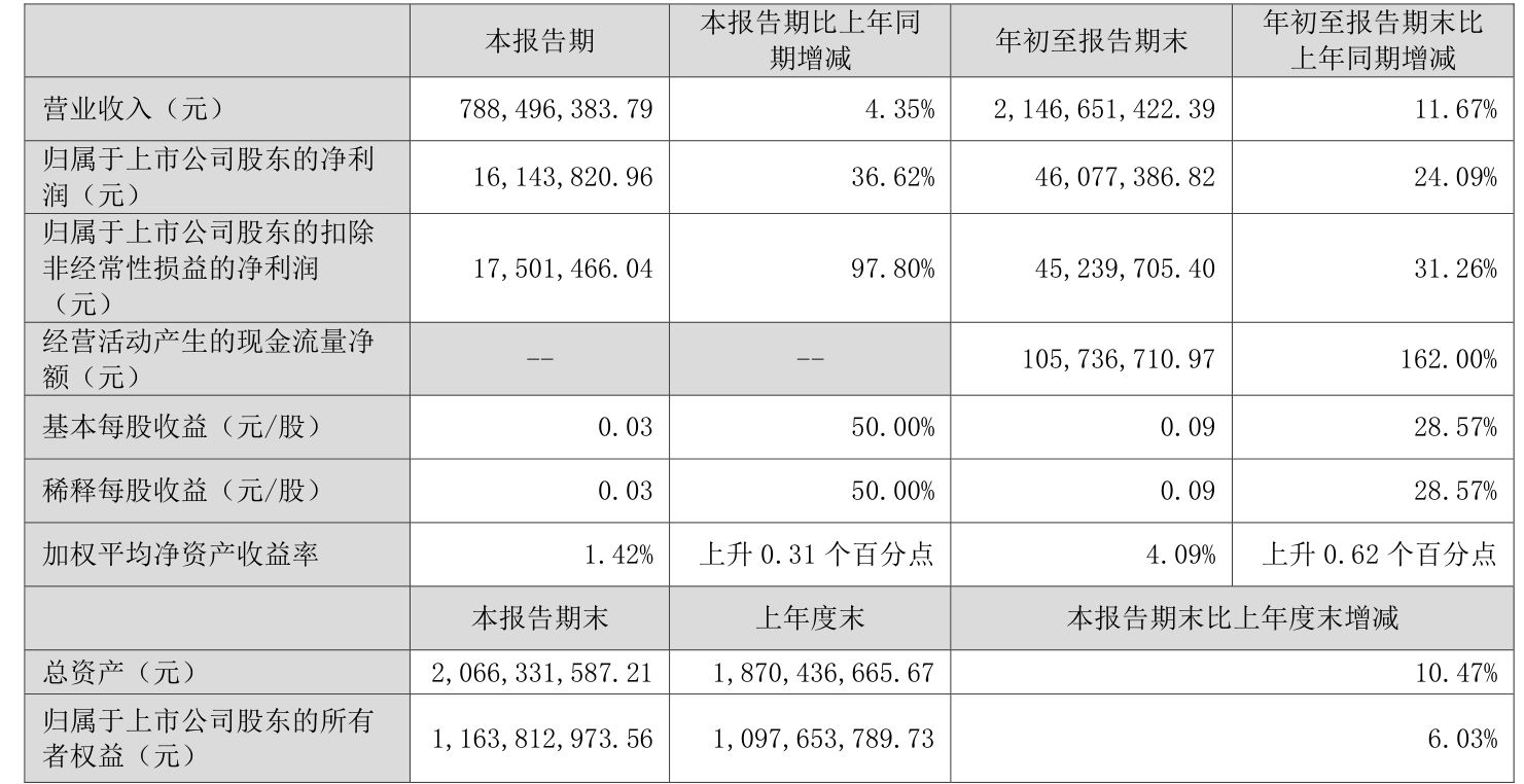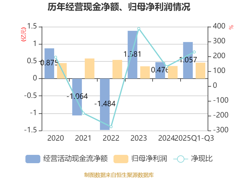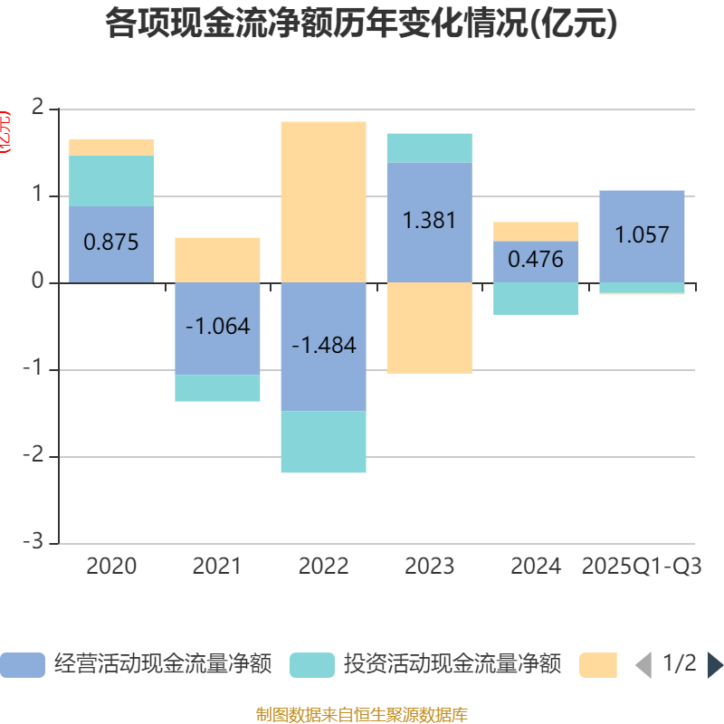 2025年前三季度,公司经营活动现金流净额为1.06亿元,同比增长162%;筹资活动现金流净额-138.09万元,同比减少1590.12万元;投资活动现金流净额-1234.21万元,上年同期为-3585.37万元。