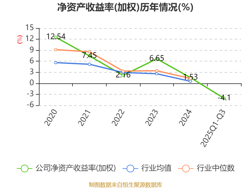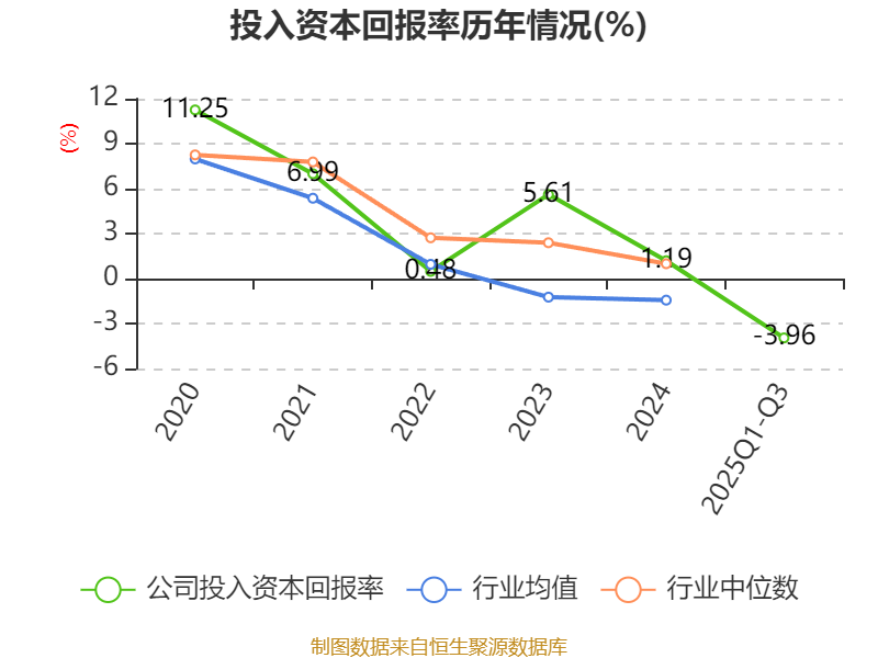盈利能力方面, 2025年前三季度公司加权平均净资产收益率为-4.1%,同比下降6.76个百分点。公司2025年前三季度投入资本回报率为-3.96%,较上年同期下降6.36个百分点。
