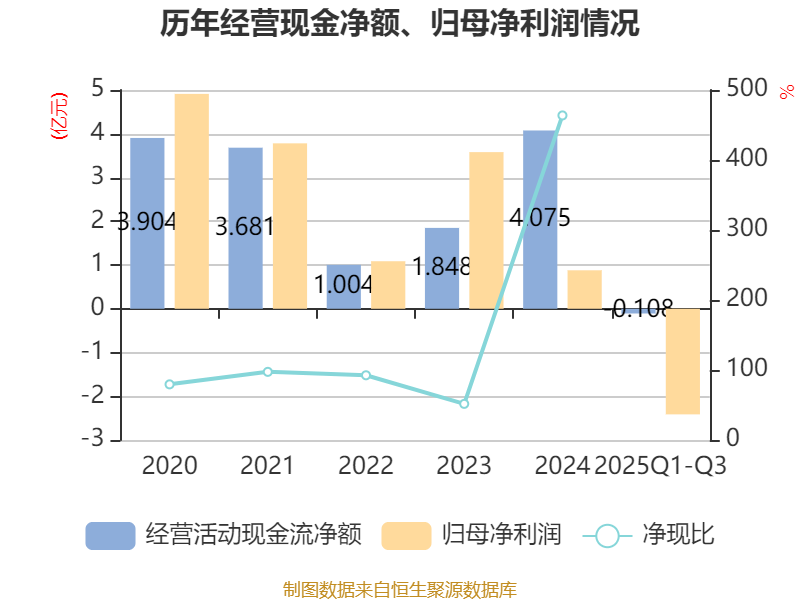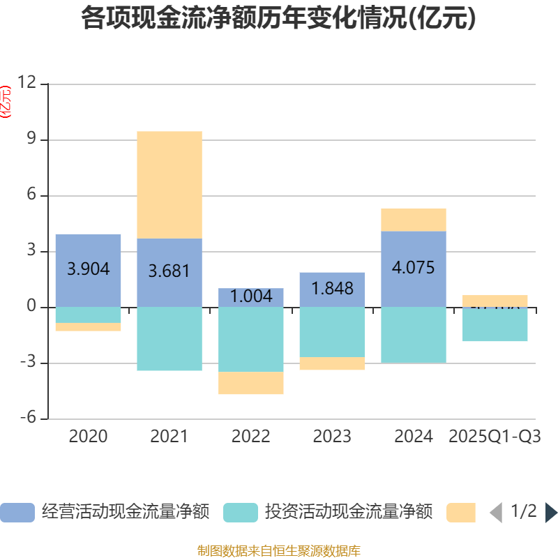 2025年前三季度,公司经营活动现金流净额为-1083.97万元,同比增加9316.77万元;筹资活动现金流净额6349.93万元,同比增加9215.82万元;投资活动现金流净额-1.73亿元,上年同期为-2.24亿元。