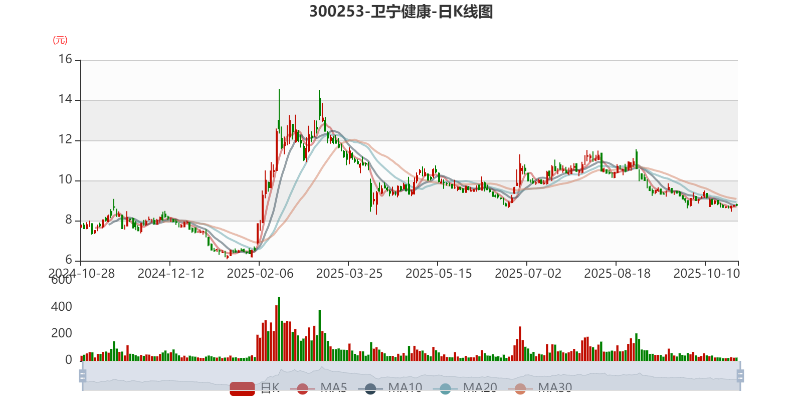 中证智能财讯卫宁健康(300253)10月28日披露2025年第三季度报告。前三季度公司实现营业总收入12.96亿元,同比下降32.27%;归母净利润亏损2.41亿元,上年同期盈利1.55亿元;扣非净利润亏损2.28亿元,上年同期盈利1.42亿元;经营活动产生的现金流量净额为-1083.97万元,上年同期为-1.04亿元;报告期内,卫宁健康基本每股收益为-0.1093元,加权平均净资产收益率为-4.10%。