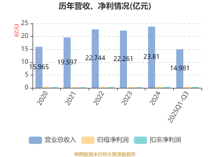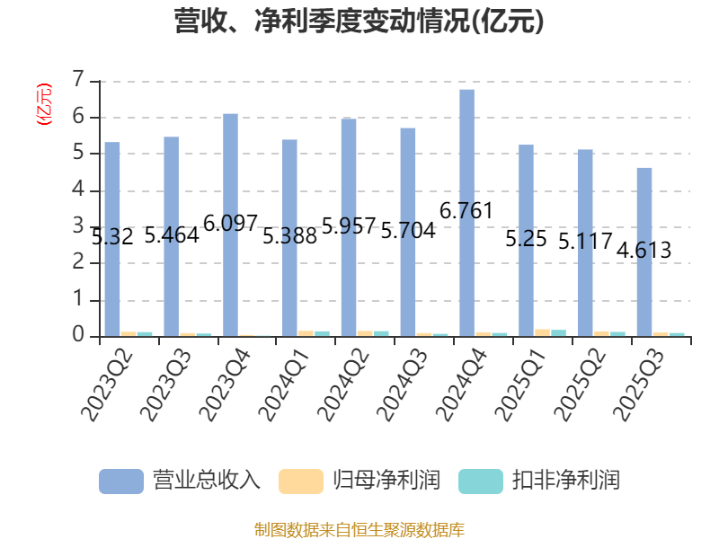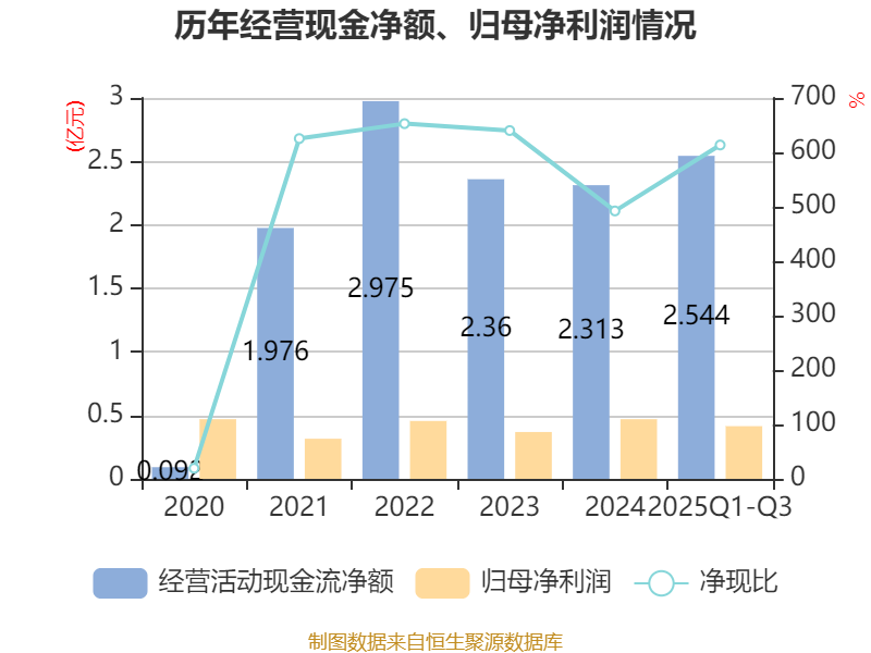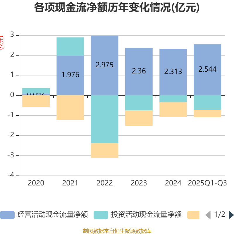 2025年前三季度,公司经营活动现金流净额为2.54亿元,同比增长21.77%;筹资活动现金流净额-3739.13万元,同比增加1213.39万元;投资活动现金流净额-7208.08万元,上年同期为-6614.68万元。