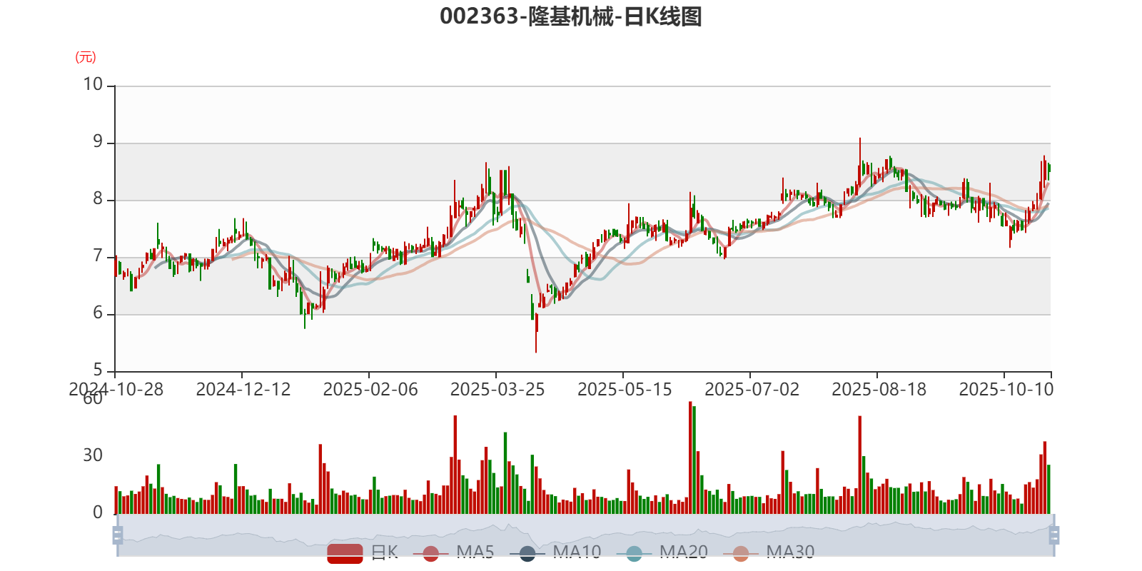 中证智能财讯隆基机械(002363)10月28日披露2025年第三季度报告。前三季度公司实现营业总收入14.98亿元,同比下降12.13%;归母净利润4146.04万元,同比增长12.82%;扣非净利润3693.71万元,同比增长14.39%;经营活动产生的现金流量净额为2.54亿元,同比增长21.77%;报告期内,隆基机械基本每股收益为0.1元,加权平均净资产收益率为1.95%。